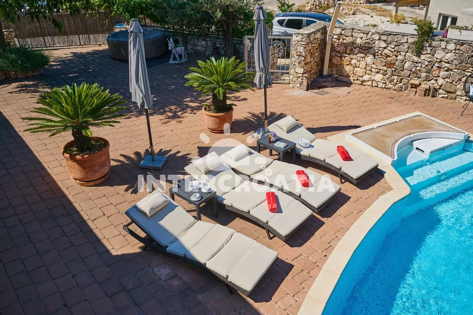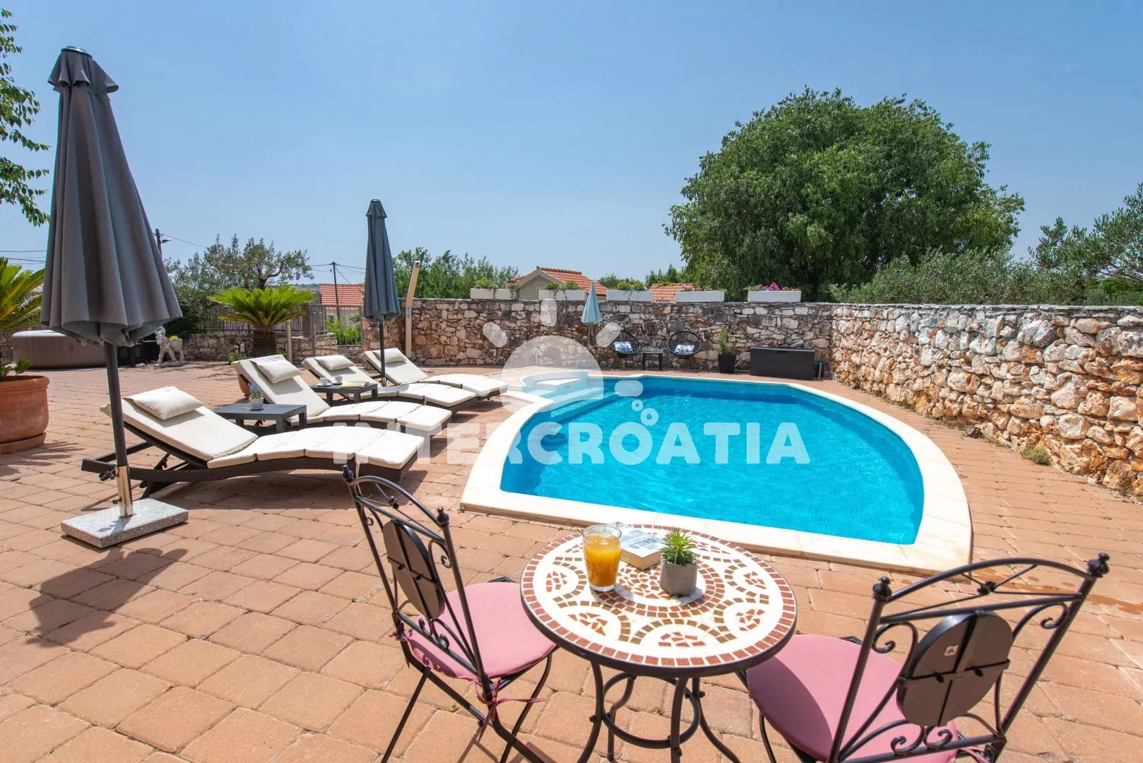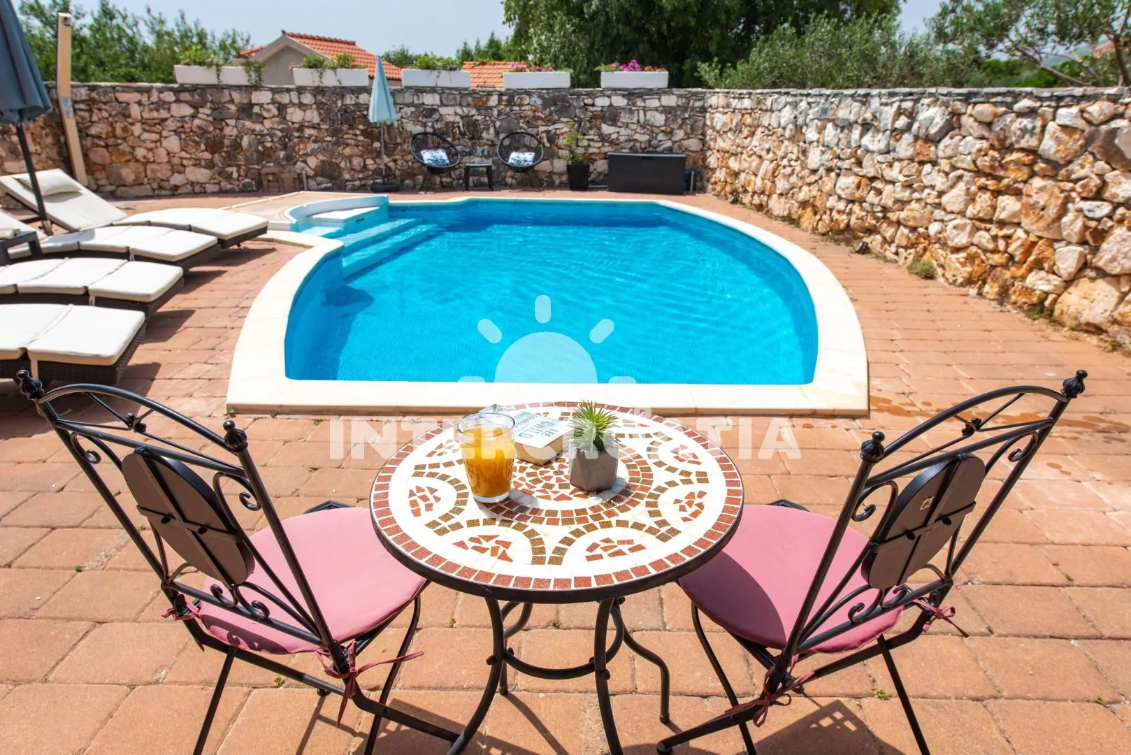 Moderně zařízená a samostatně stojící vila s bazénem se nachází v klidné lokalitě. Vila je oplocená a nabízí dostatek soukromý, k dispozici je zahrada, bazén s lehátky, několik teras s posezením a zděný gril. Parkovací místa pro automobily jsou přímo u vily.