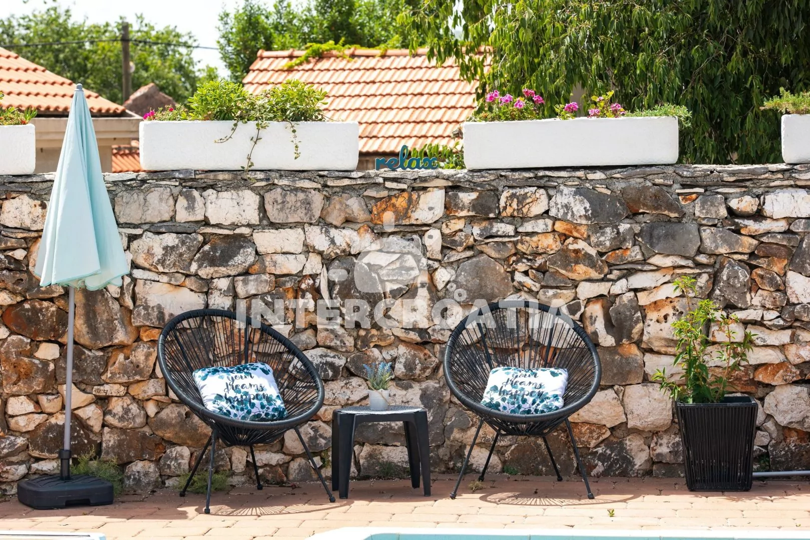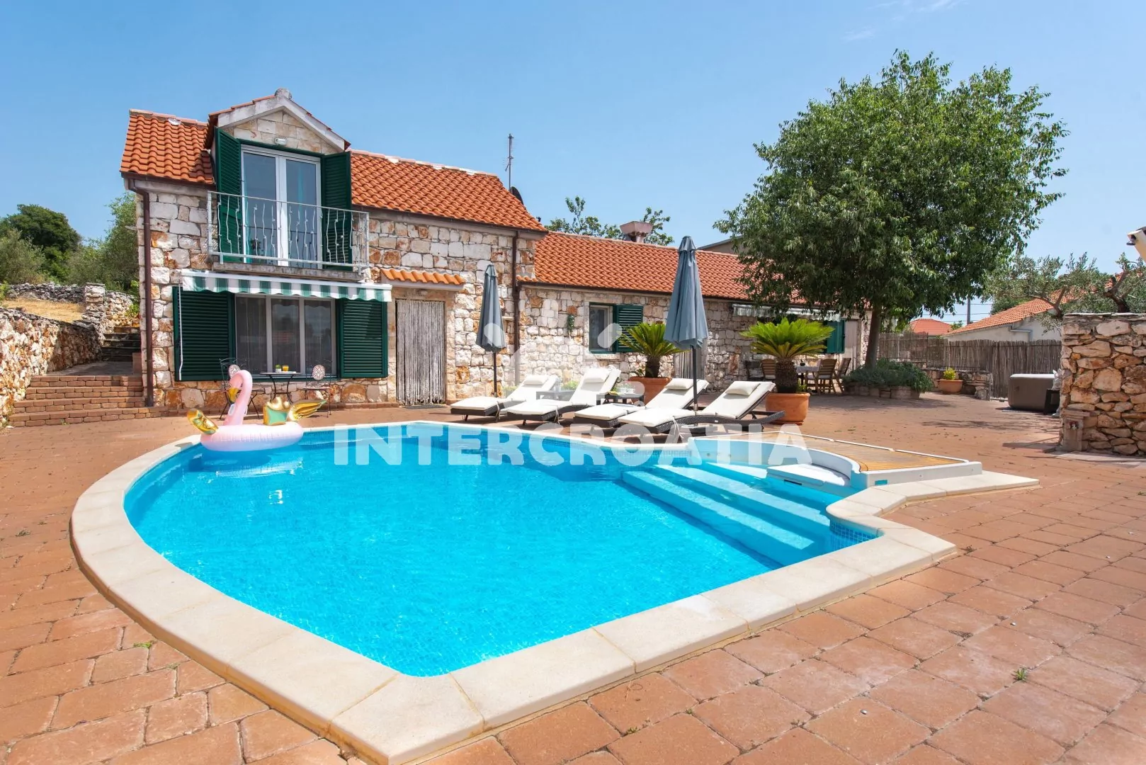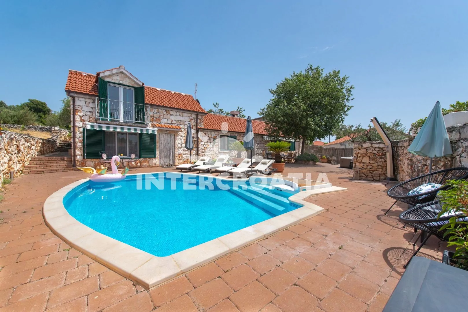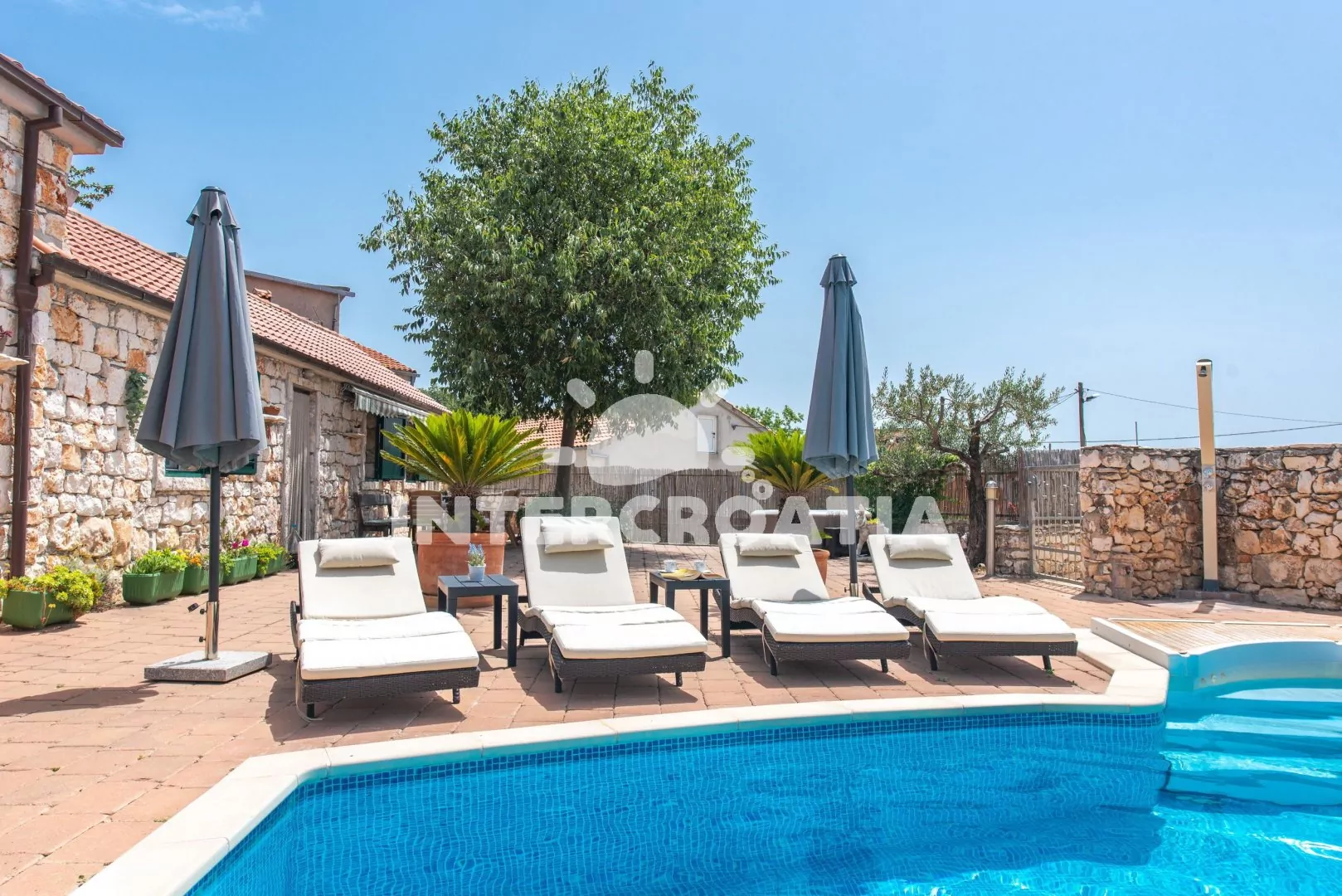 Moderně zařízená a samostatně stojící vila s bazénem se nachází v klidné lokalitě. Vila je oplocená a nabízí dostatek soukromý, k dispozici je zahrada, bazén s lehátky, několik teras s posezením a zděný gril. Parkovací místa pro automobily jsou přímo u vily.