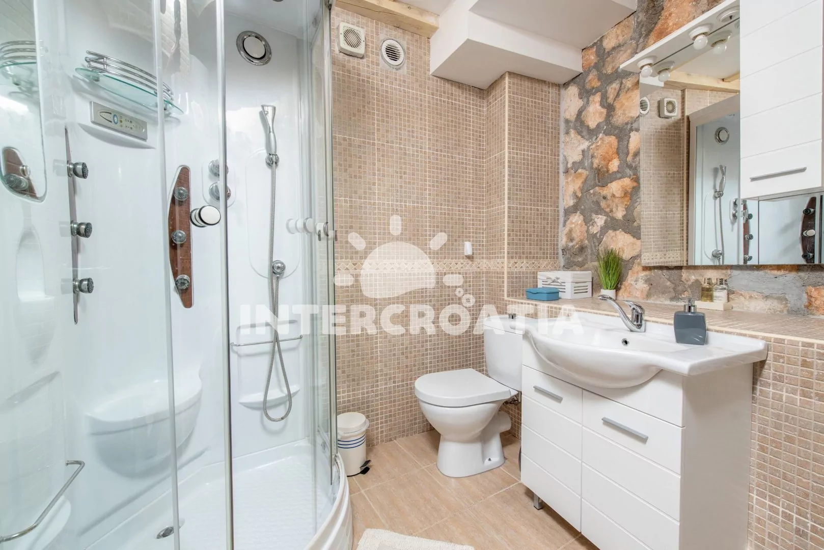 Klimatizovaná, dvoupodlažní vila (135 m2) s terasami a venkovním posezením. Vila má 3 ložnice, 4 koupelny a je vhodná pro 6 až 8 osob. Obývací pokoj je spojený s kuchyní. Kuchyňská linka je vybavena sklokeramickou varnou deskou, digestoří, vestavěnou troubou, myčkou na nádobí, rychlovarnou konvicí, mikrovlnnou troubou, kávovarem, toustovačem, nádobím a lednicí s mrazákem. Obývací pokoj s jídelním stolem, pohovkou (rozložitelná na extra lůžko pro 2 osoby), televizí se satelitním programem, klimatizací a vstupy na terasu. Tři samostatné ložnice vybavené vždy s dvoulůžkem a klimatizací. Celkem 4 koupelny se sprchovým koutem, umyvadlem, fénem a wc. Dále je k dispozici pračka, žehlička a sejf, na požádání dětská postýlka.