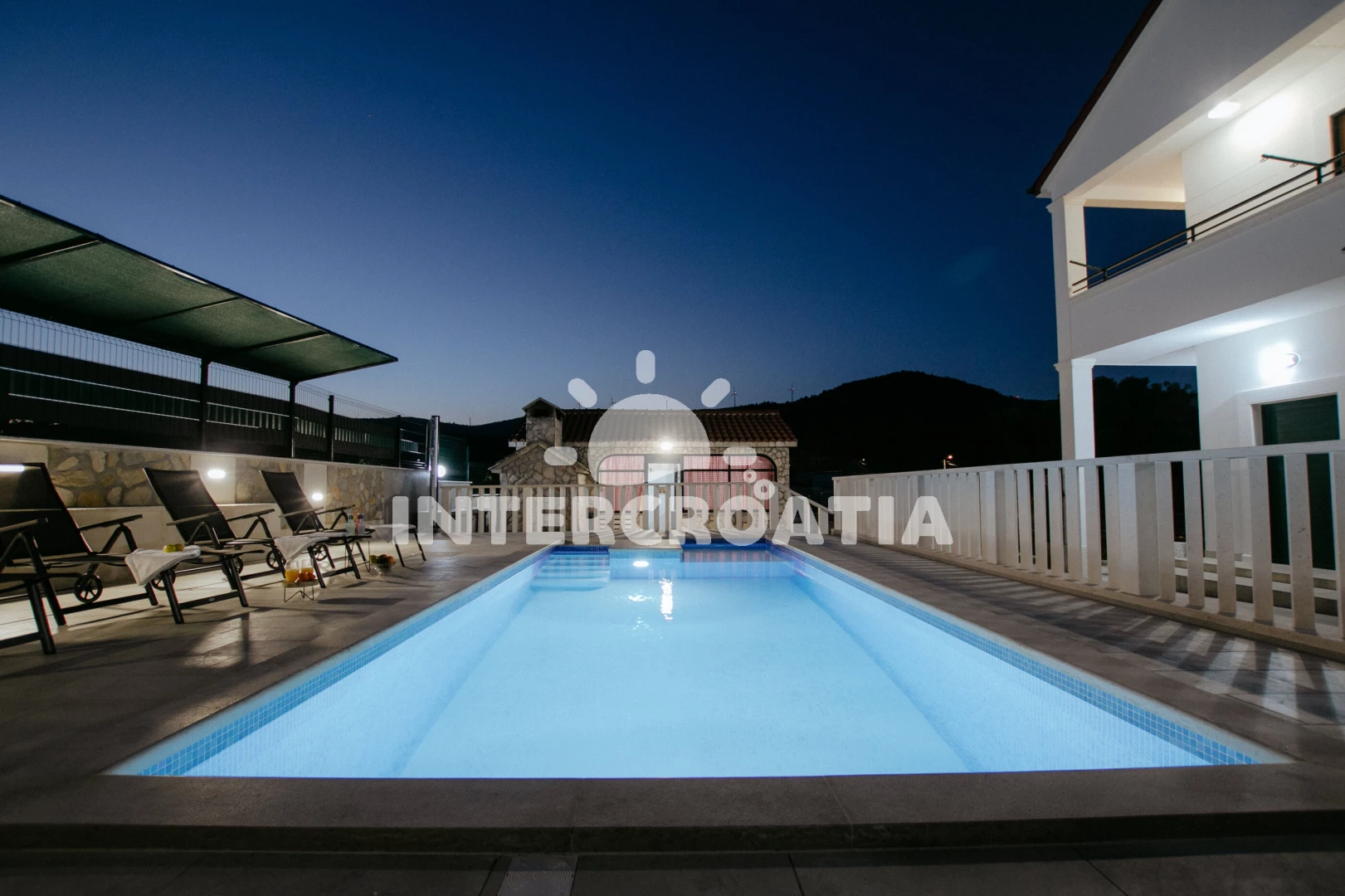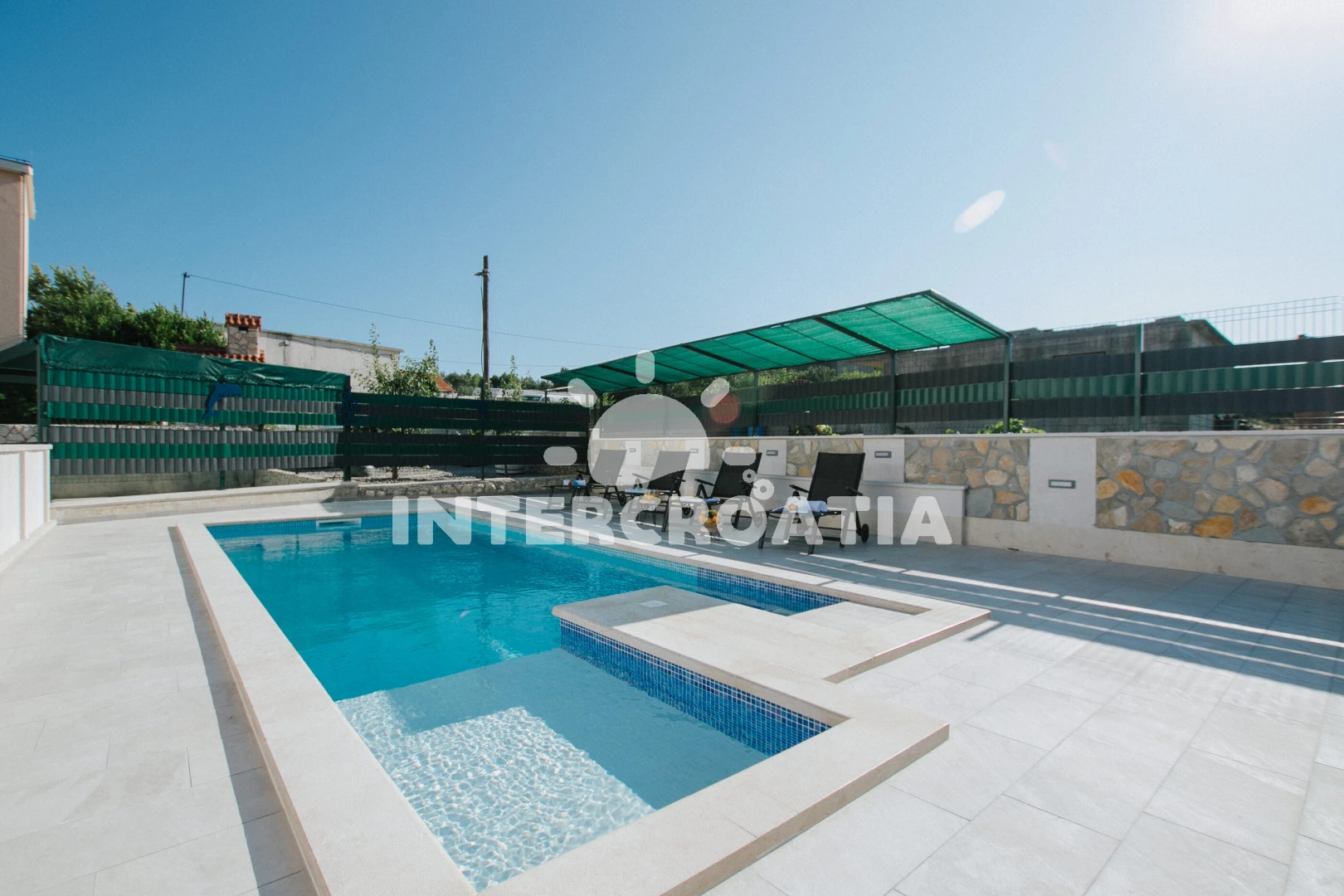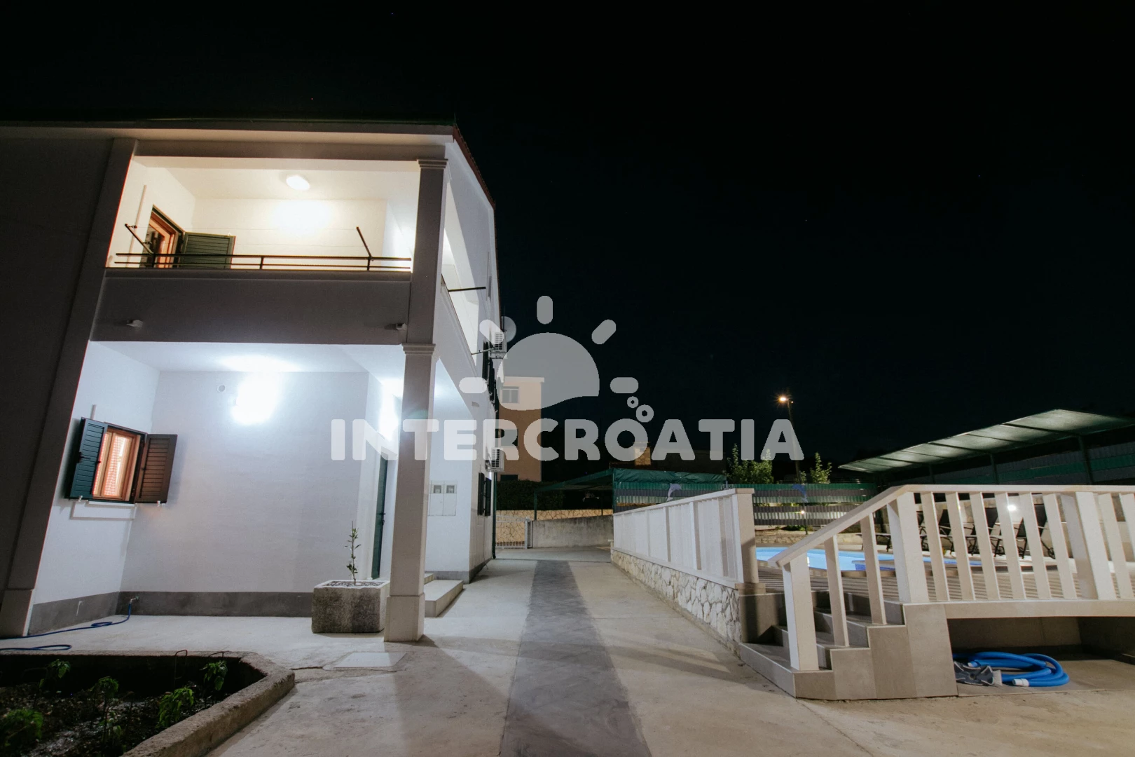Domek se nachází 1200 m od moře a pláže. Pláž je oblázková. Domek disponuje bazénem s lehátky pro ubytované hosty. U objektu je k dispozici společná zahrada s posezením a grilem. Parkování je před domem.