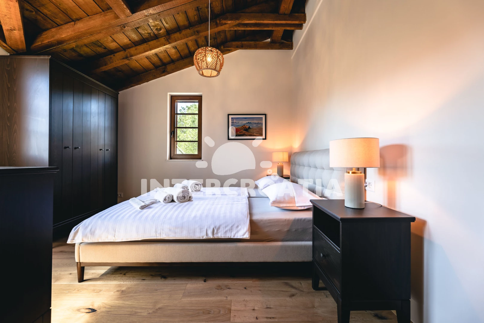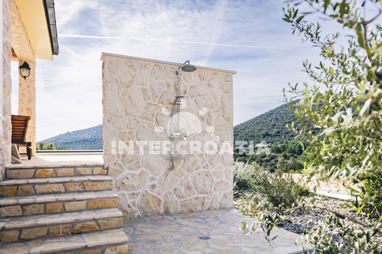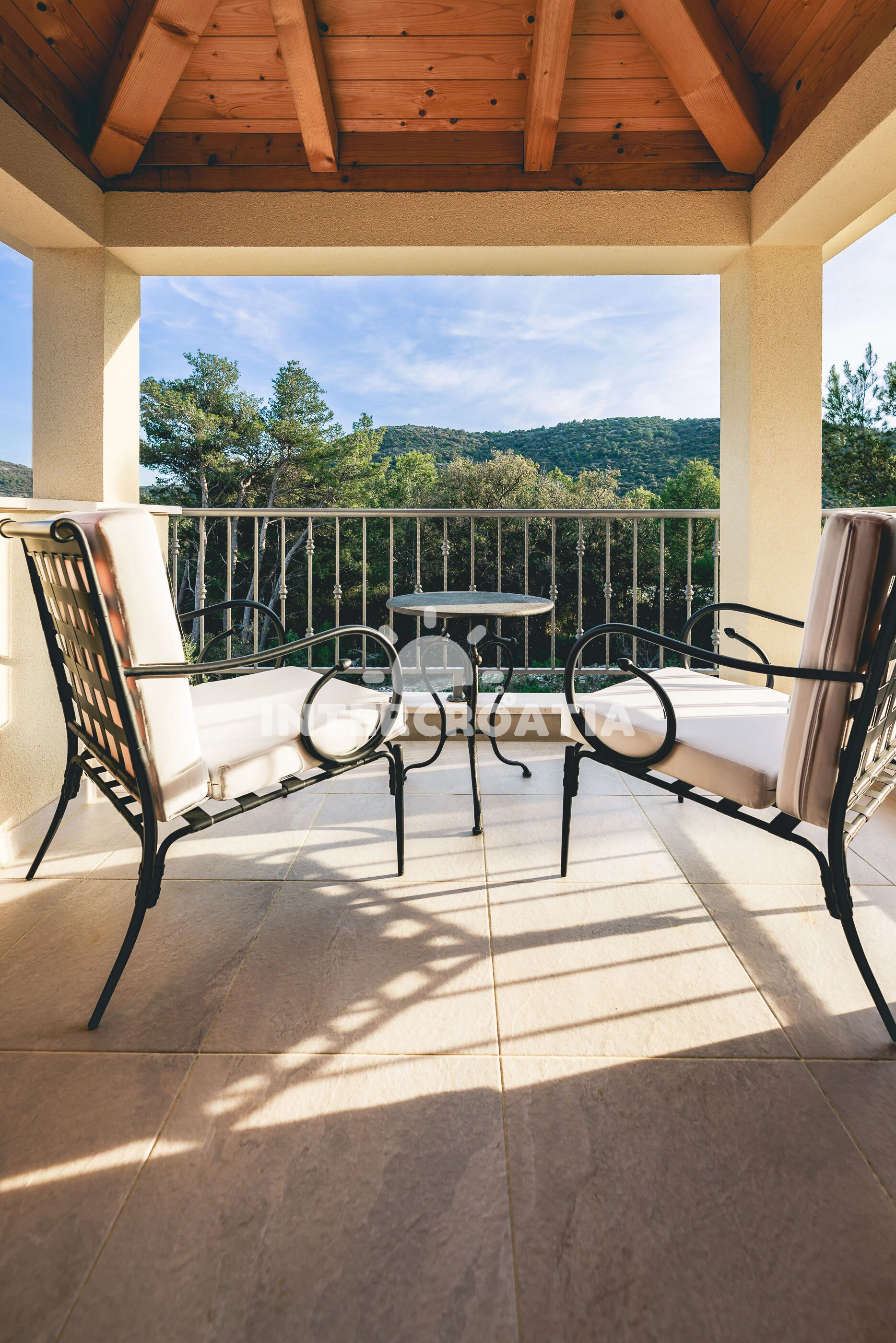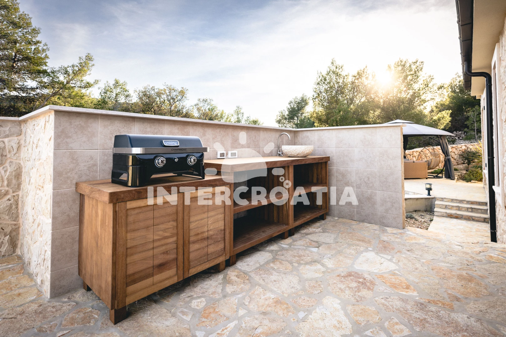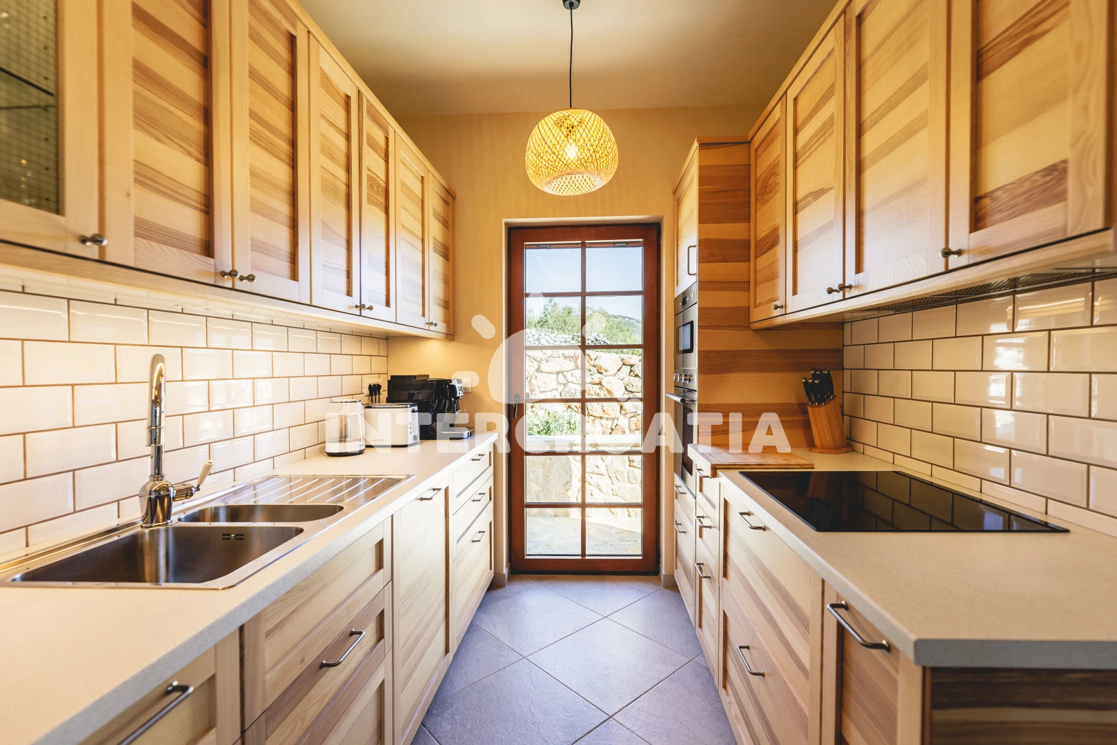 Luxusně zařízená privátní vila s vyhřívaným bazénem, lehátky, pergolou, zahradní kuchyní s grilem a saunou. Vila nabízí dostatek soukromí a nachází se jen 7 minut pěší chůzí od moře a oblázkové pláže. Vila má k dispozici oplocenou zahradu 900 m2, s několika terasami a venkovním posezením. Dále je k dispozici přímo u vily parkoviště pro automobily.