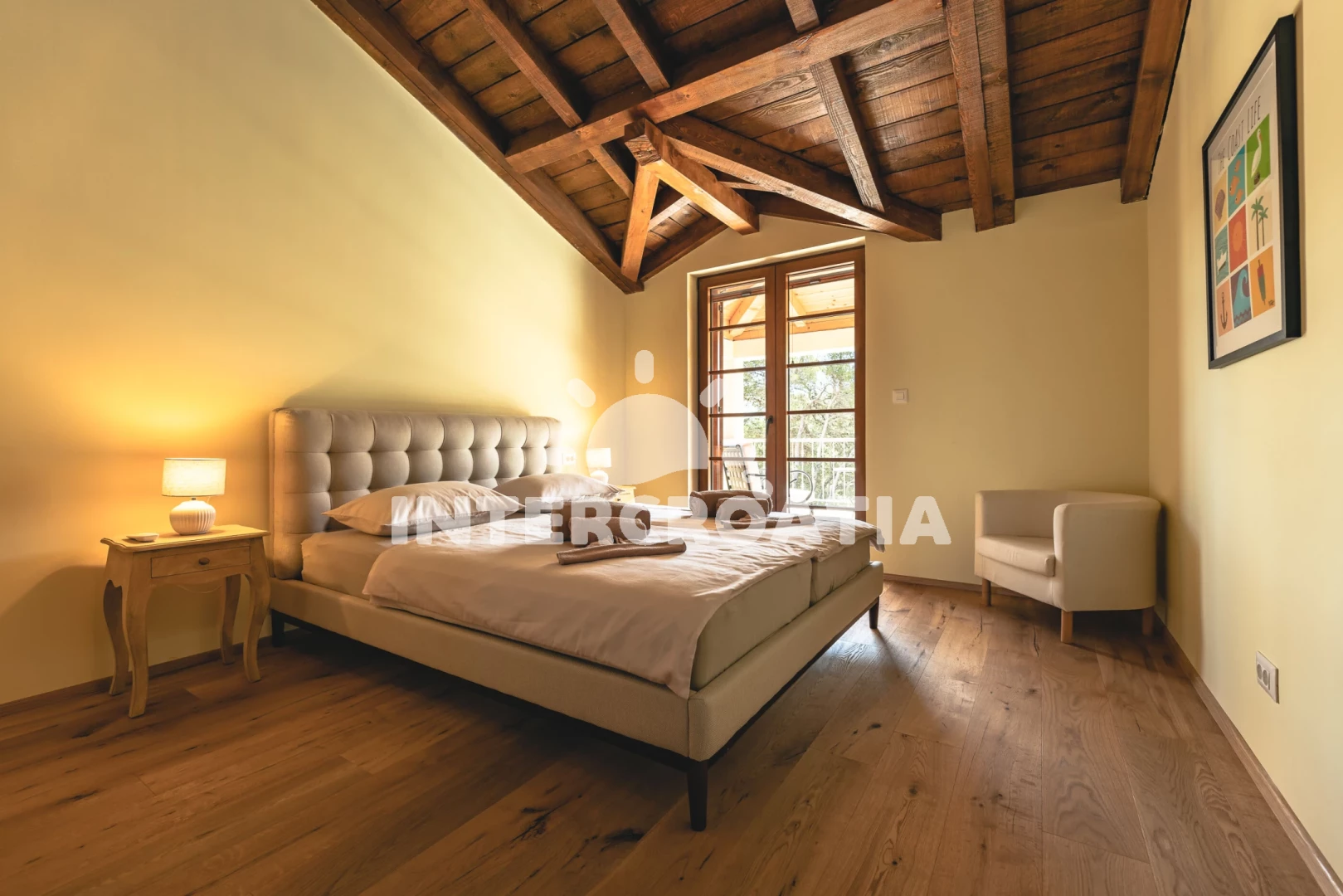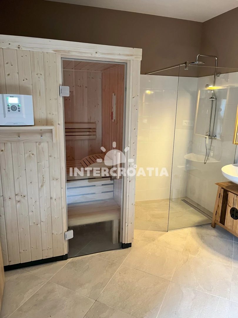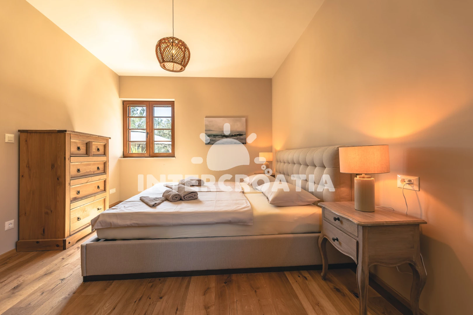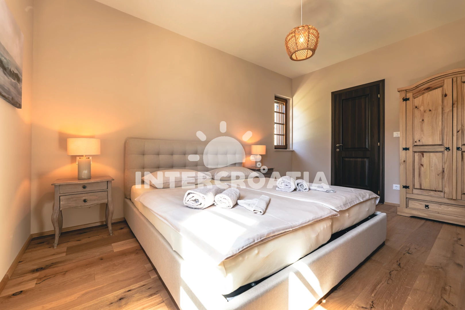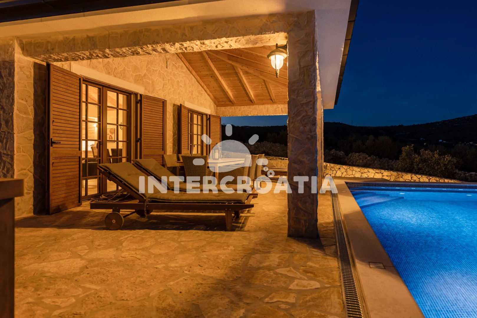 Luxusně zařízená privátní vila s vyhřívaným bazénem, lehátky, pergolou, zahradní kuchyní s grilem a saunou. Vila nabízí dostatek soukromí a nachází se jen 7 minut pěší chůzí od moře a oblázkové pláže. Vila má k dispozici oplocenou zahradu 900 m2, s několika terasami a venkovním posezením. Dále je k dispozici přímo u vily parkoviště pro automobily.