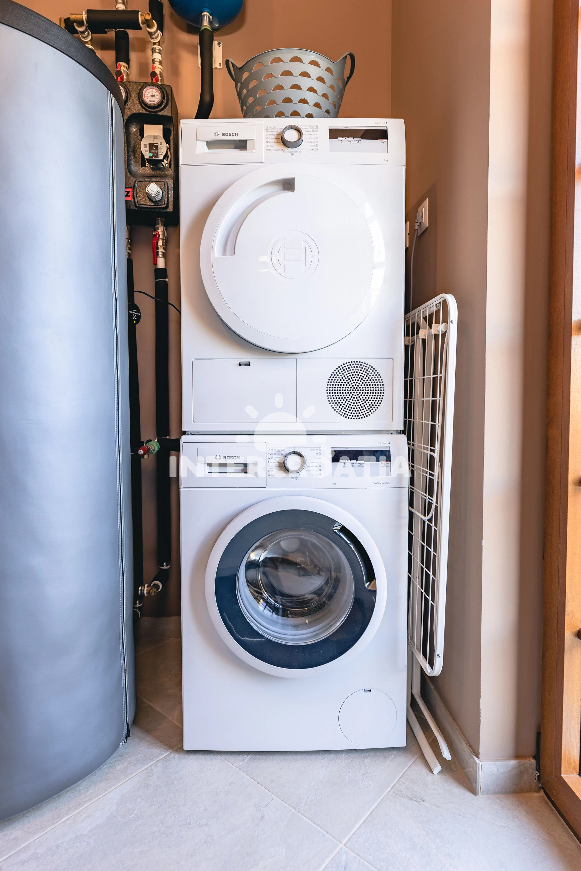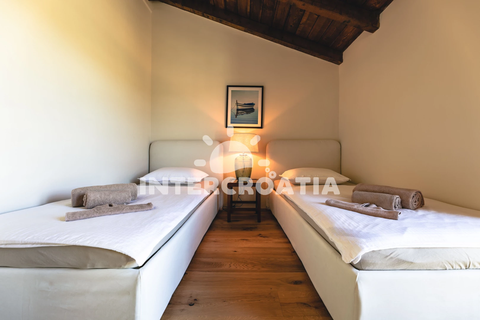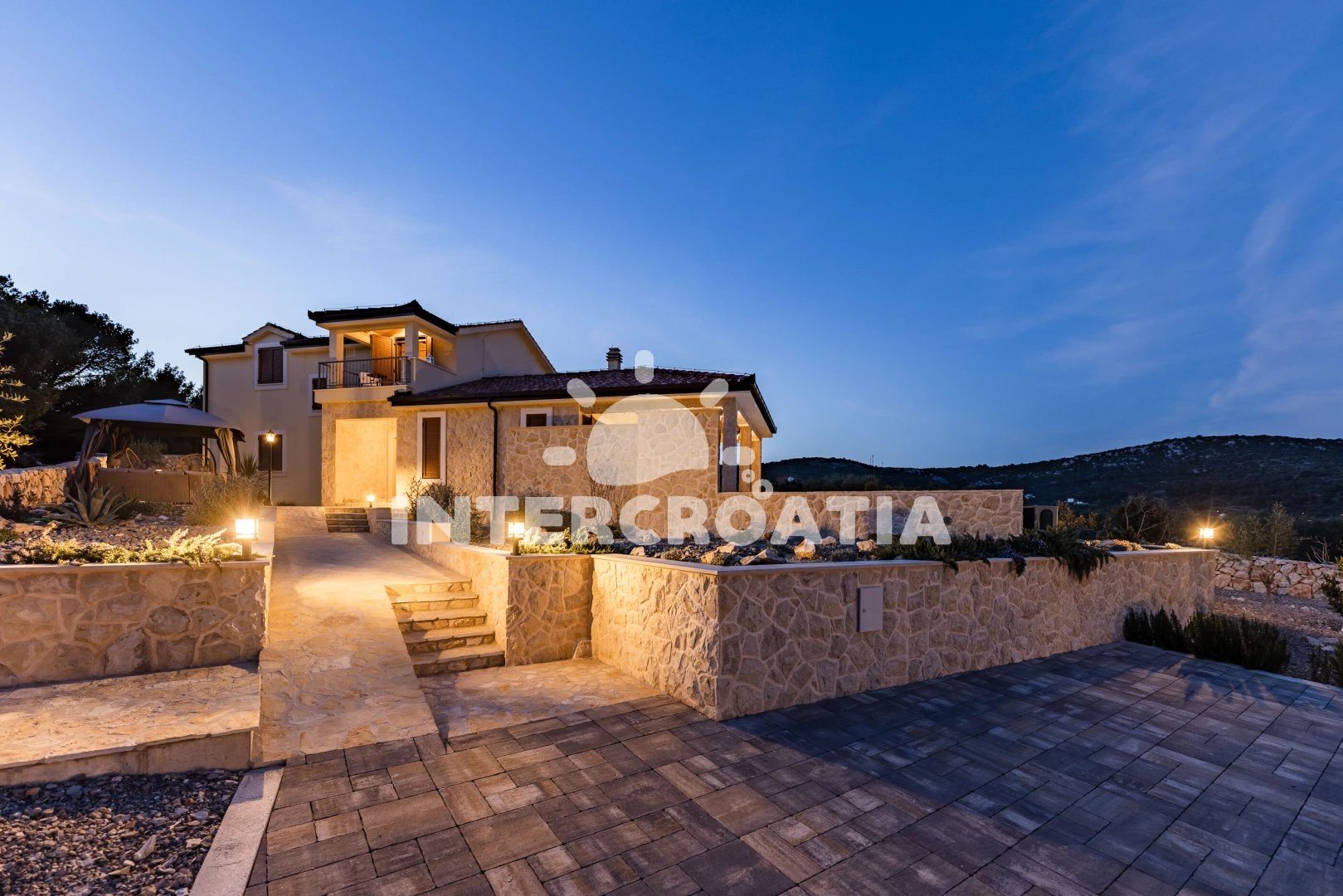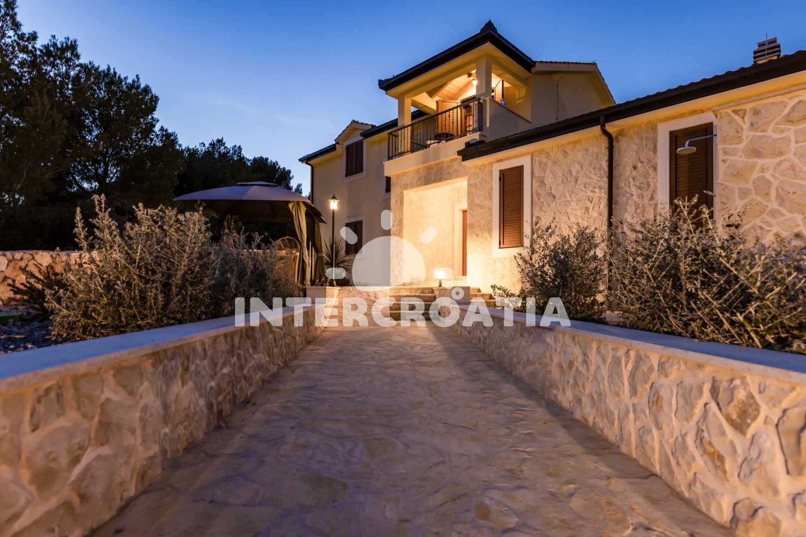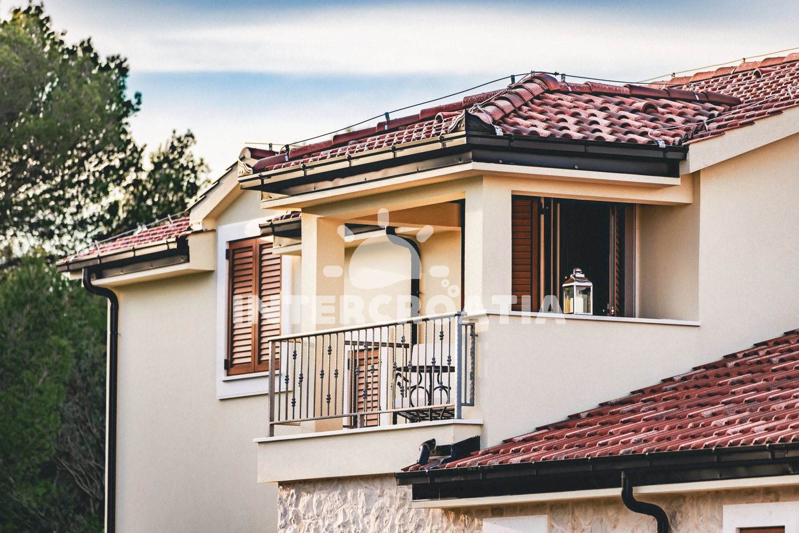 Patrová vila s lodžiemi, terasami, venkovním posezením a částečným výhledem na moře. Vila má 4 ložnice, 4 koupelny a je vhodná pro až 8 osob. Všechny místnosti jsou klimatizované. Prostorná kuchyňská linka s varnou deskou, digestoří, vestavěnou troubou, myčkou na nádobí, mikrovlnnou troubou, kávovarem, toustovačem, rychlovarnou konvicí, nádobím a lednicí s mrazákem. Obývací pokoj s jídelním stolem, sedací soupravou, televizí se satelitním programem a vstupem na terasu. První ložnice s dvoulůžkem a vstupem na terasu. Druhá a třetí ložnice je vybavena vždy s jedním dvoulůžkem. Čtvrtá ložnice se dvěma jednolůžky. Tři koupelny se sprchovým koutem, umyvadlem a wc. Čtvrtá koupelna s vanou, sprchovou zástěnou, umyvadlem a wc. Dále je k dispozici pračka, sušička, žehlička a sauna. Hostům je k dispozici parkování přímo u vily zdarma.
