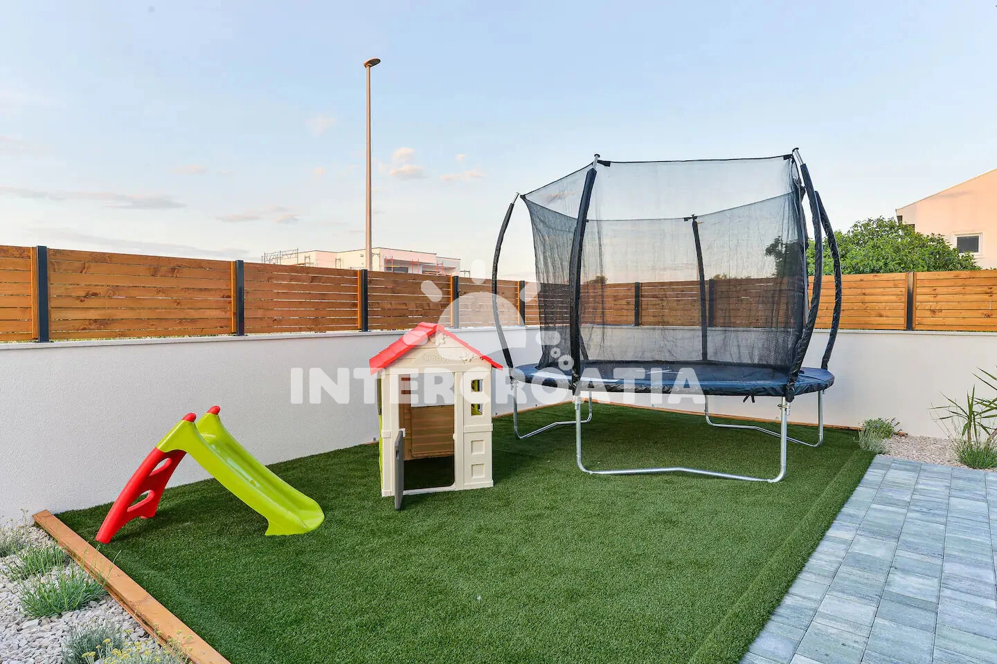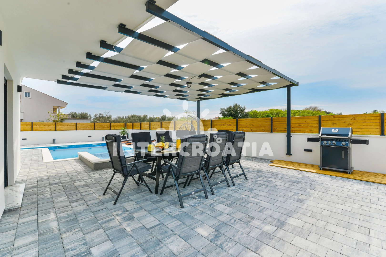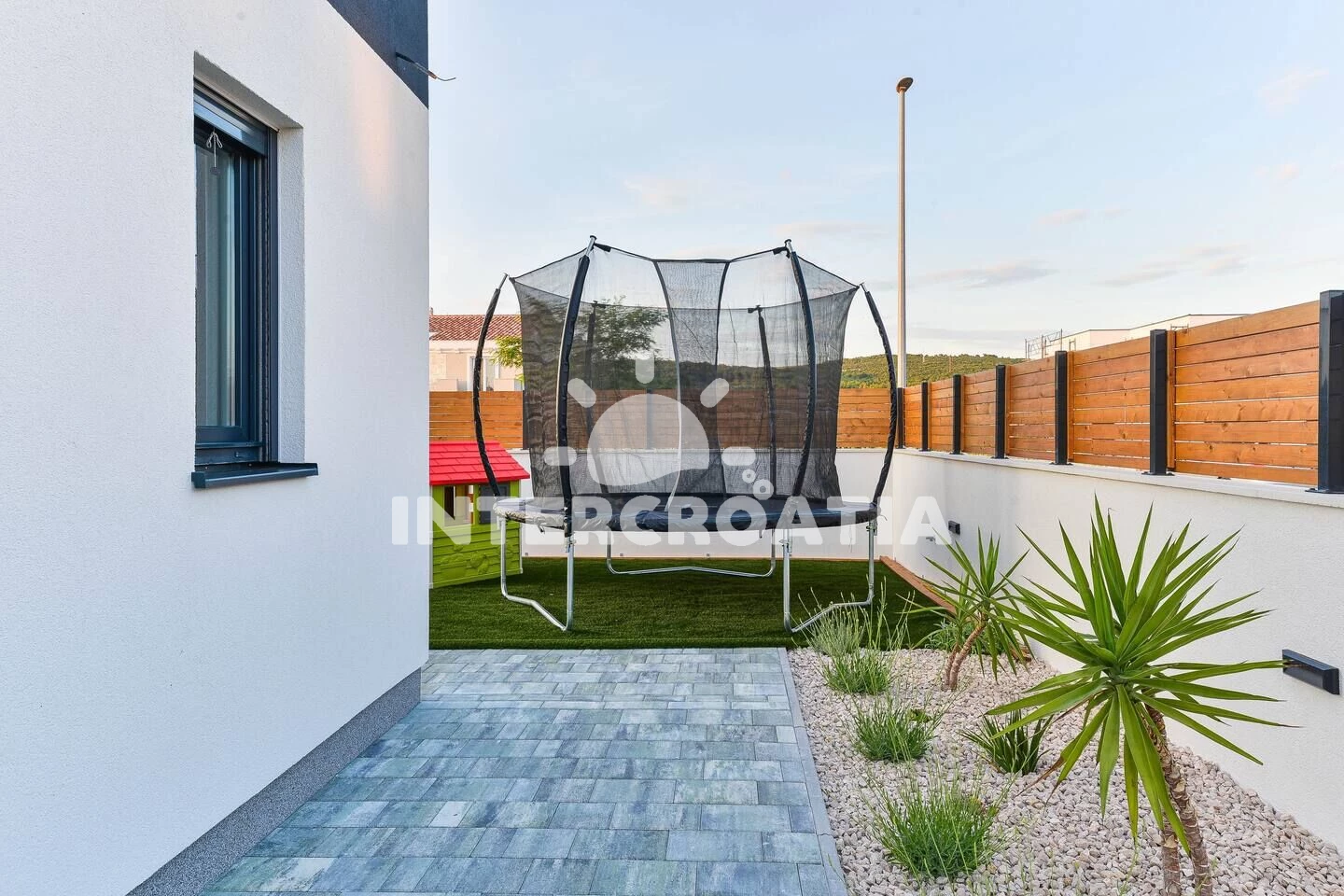 Vila se nachází 600 m od moře a pláže. Pláž je oblázková a betonové desky. Vila disponuje bazénem s lehátky pro ubytované hosty. K dispozici vířivka, posilovna. U objektu je k dispozici společná zahrada s posezením a grilem. Parkování je před domem.