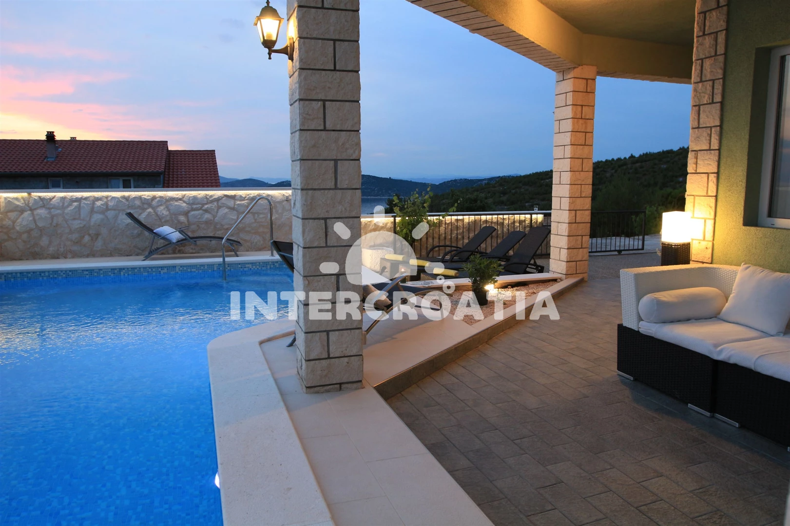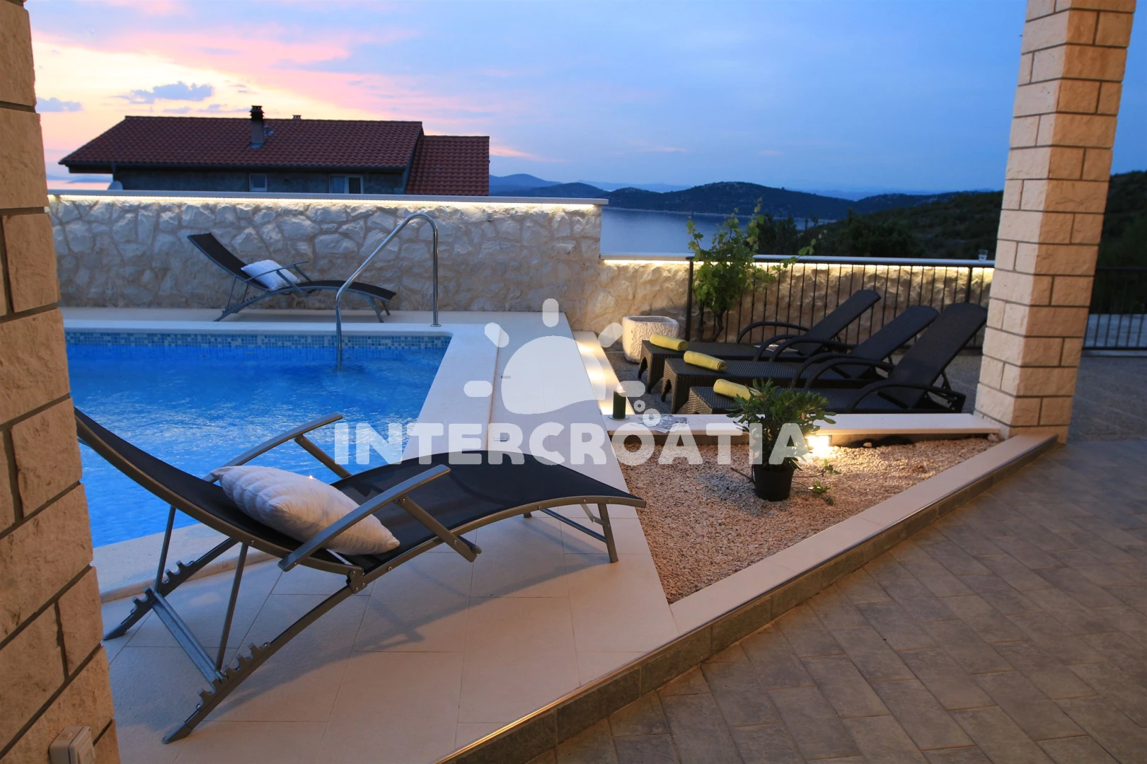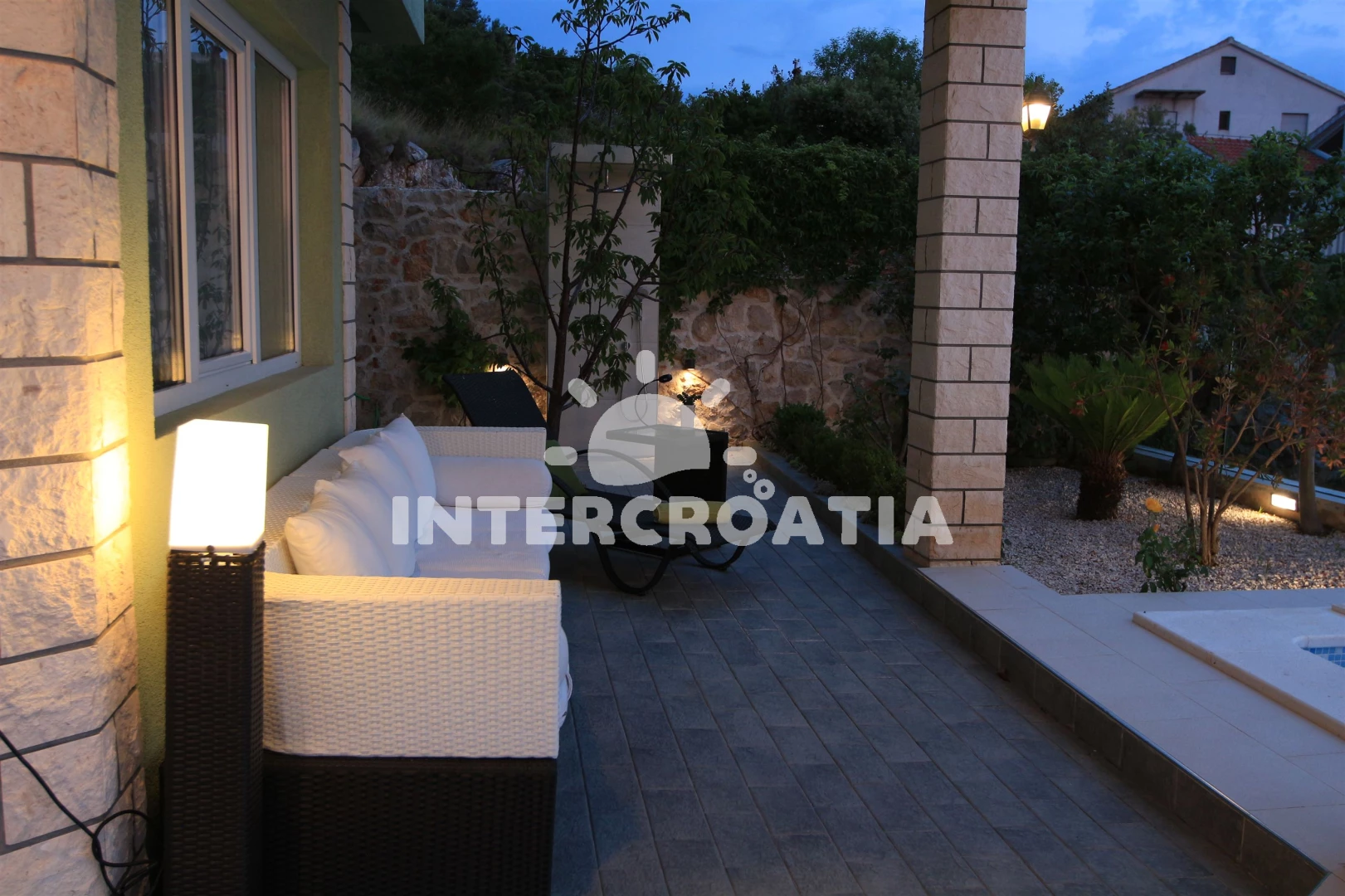 Vila se nachází 200 m od moře a pláže. Pláž je oblázková a větší kamení. Vila disponuje bazénem s lehátky pro ubytované hosty. U objektu je k dispozici společná zahrada s posezením a grilem. Parkování je před domem.