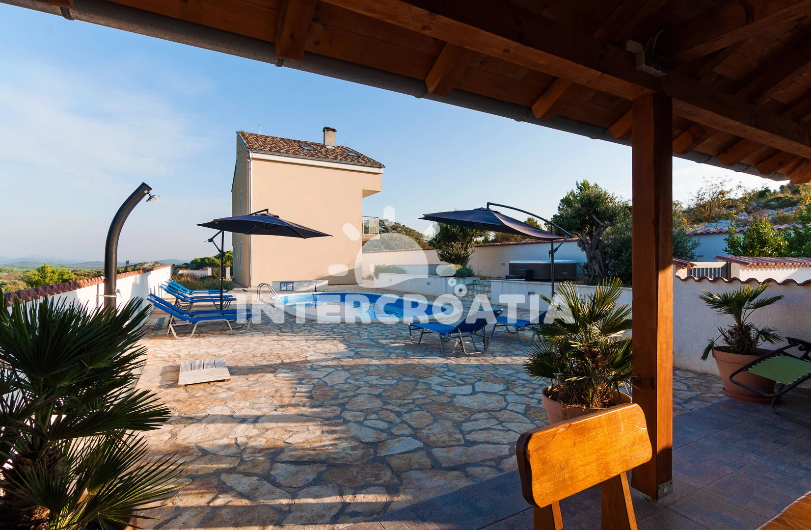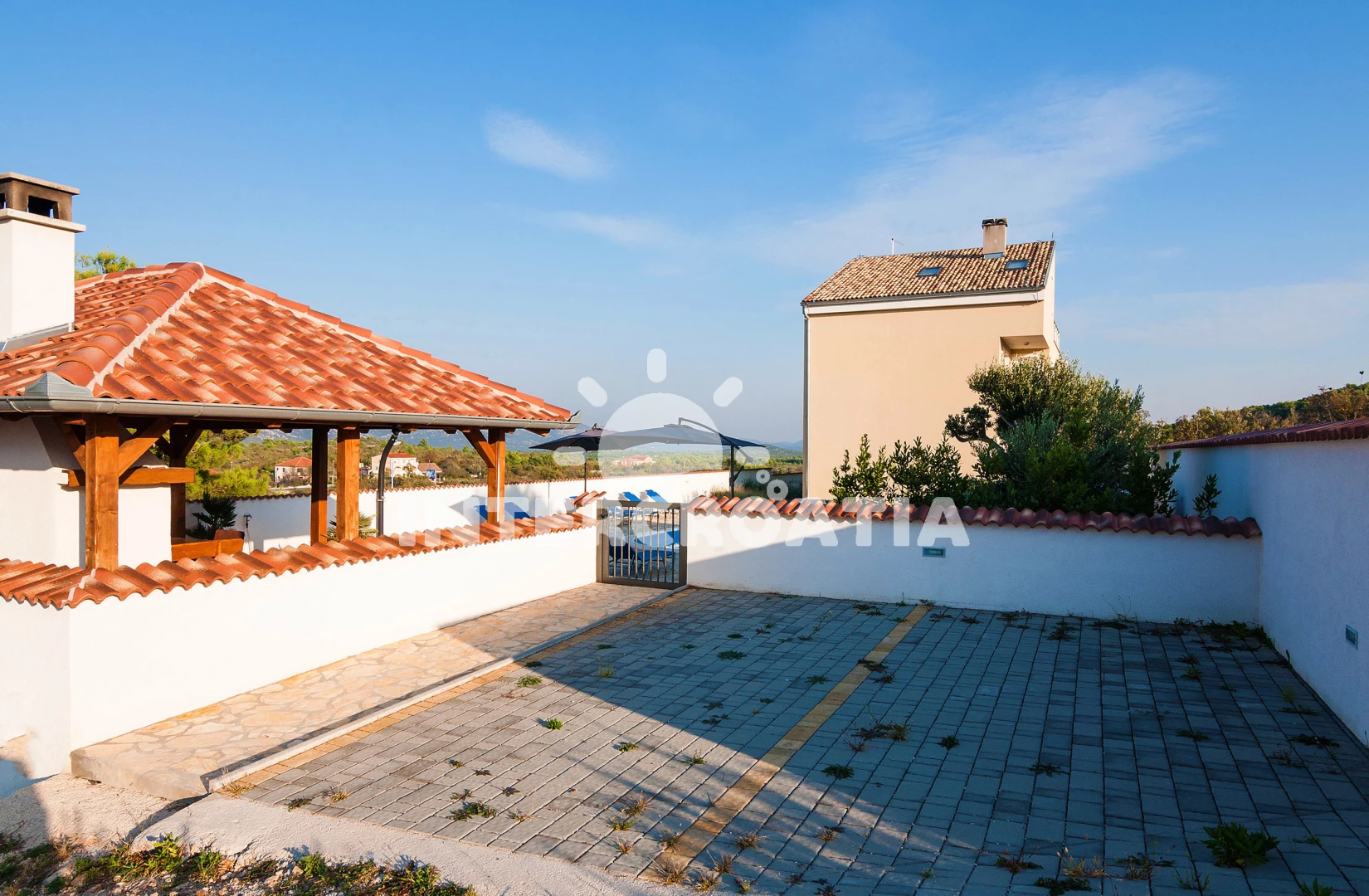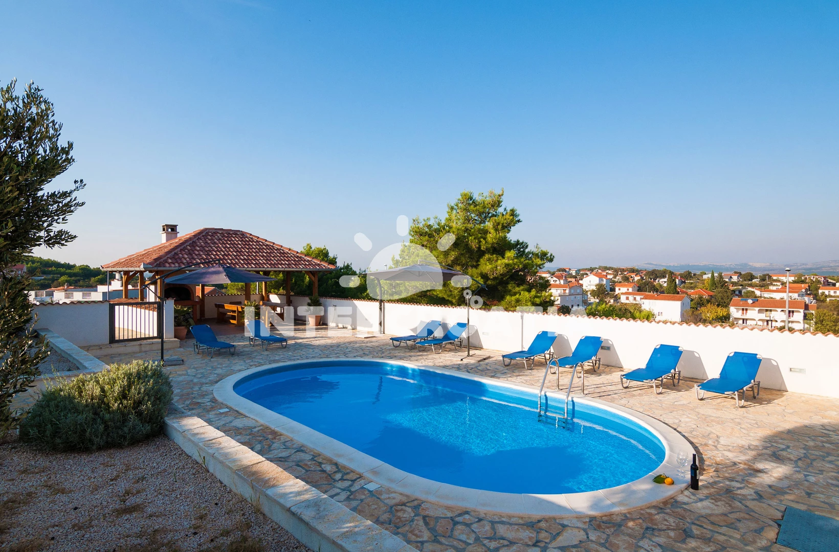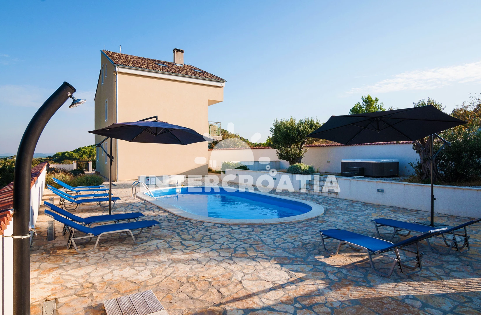 Vila se nachází 400 m od moře a pláže. Pláž je oblázková a betonové desky. Vila disponuje bazénem s lehátky pro ubytované hosty. K dispozici vířivka, posilovna, sauna. U objektu je k dispozici společná zahrada s posezením a grilem. Parkování je před domem.