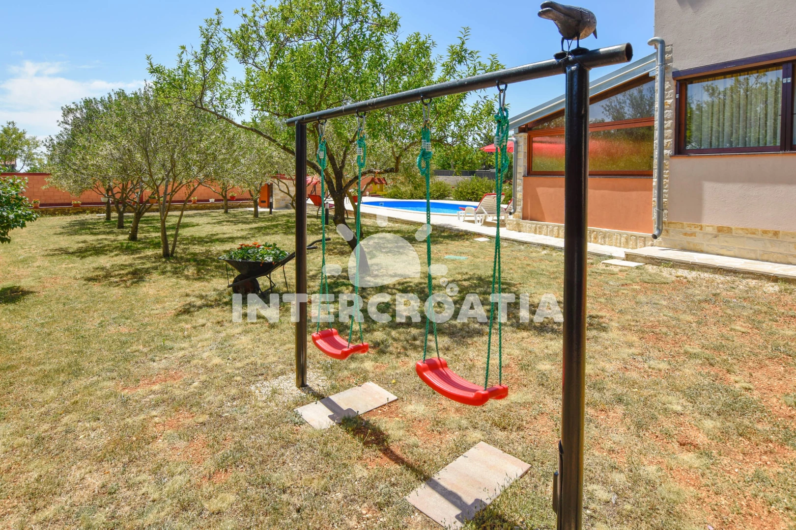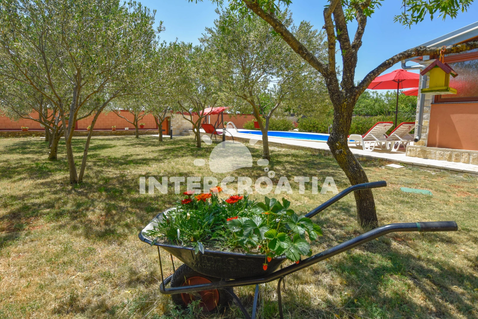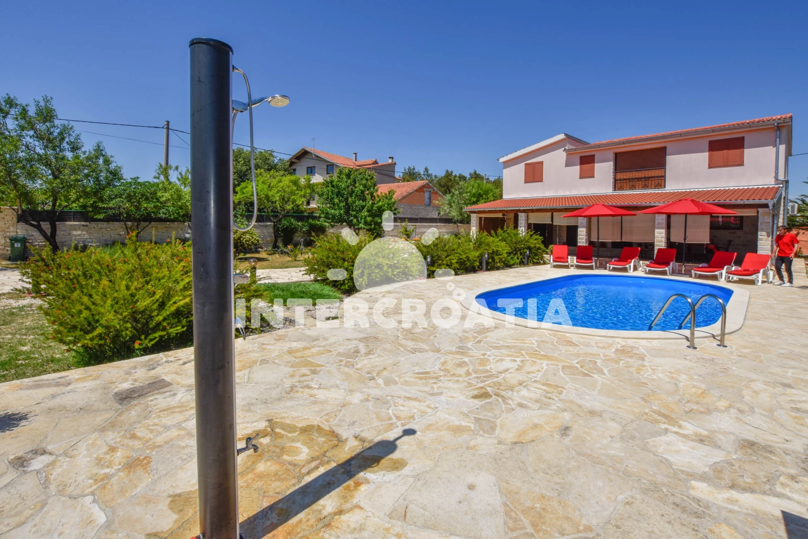 Vila se nachází 25000 m od moře a pláže. Pláž je písčitá a oblázková. Vila disponuje bazénem s lehátky pro ubytované hosty. U objektu je k dispozici společná zahrada s posezením a grilem. Parkování je před domem.