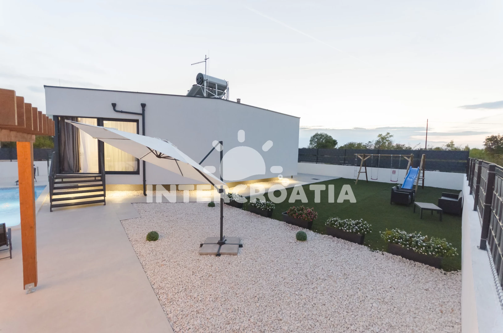 Vila se nachází 2500 m od moře a pláže. Pláž je oblázková. Vila disponuje bazénem s lehátky pro ubytované hosty. U objektu je k dispozici společná zahrada s posezením a grilem. Parkování je před domem.