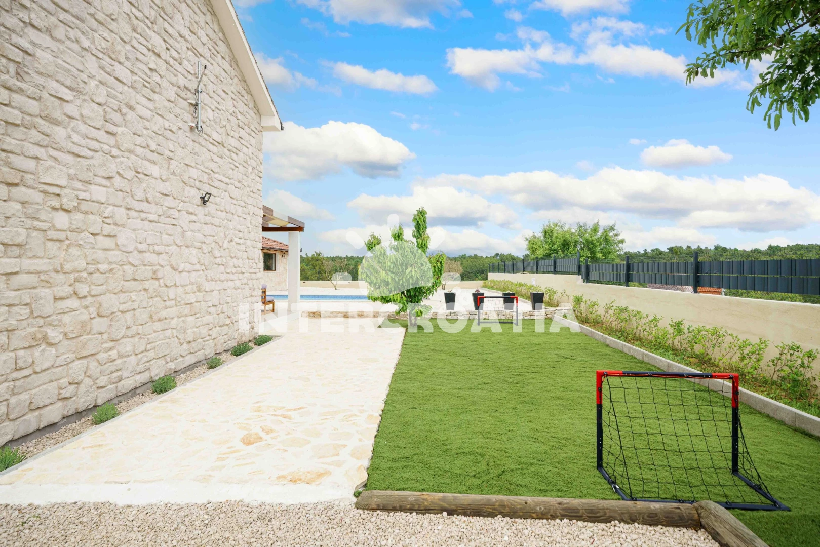 Vila se nachází 4000 m od moře a pláže. Pláž je oblázková a betonové desky. Vila disponuje bazénem s lehátky pro ubytované hosty. U objektu je k dispozici společná zahrada s posezením a grilem. Parkování je před domem.