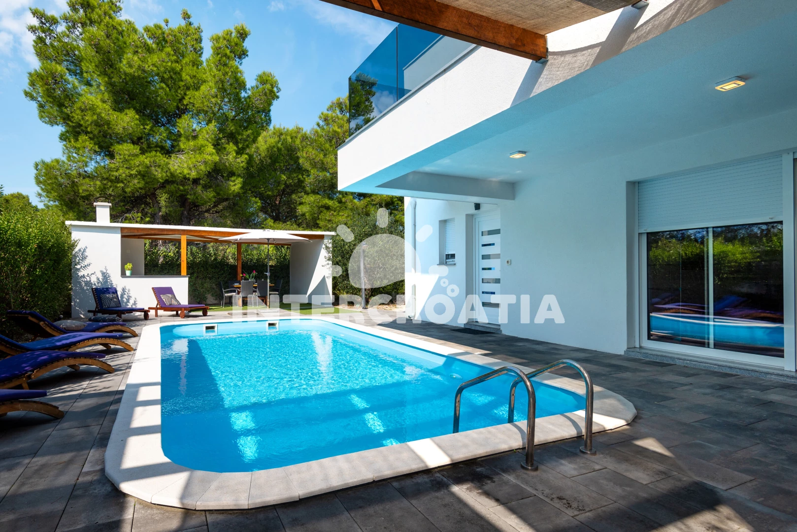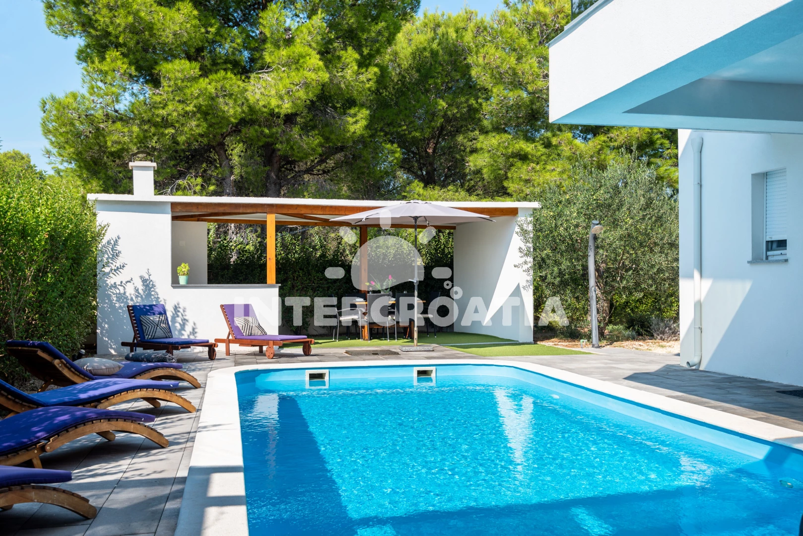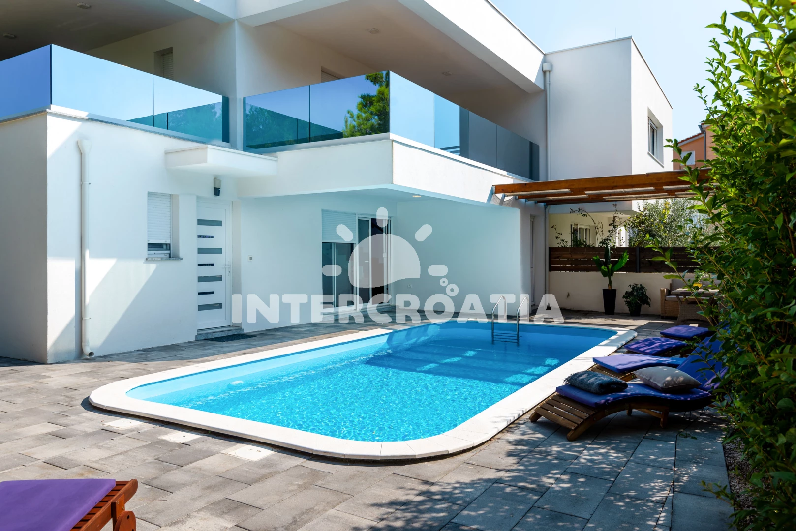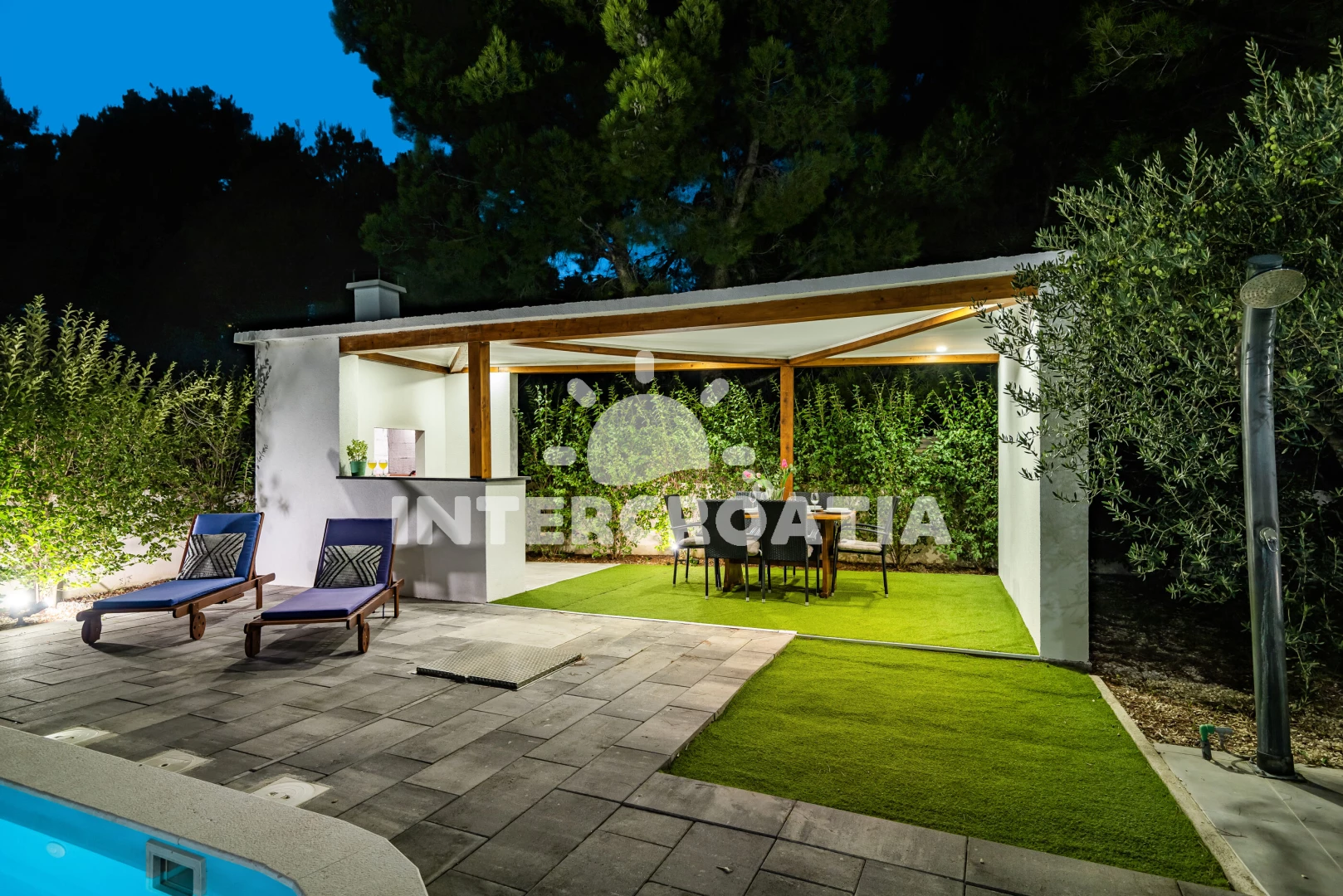 Vila se nachází 300 m od moře a pláže. Pláž je oblázková a betonové desky. Vila disponuje bazénem s lehátky pro ubytované hosty. U objektu je k dispozici společná zahrada s posezením a grilem.