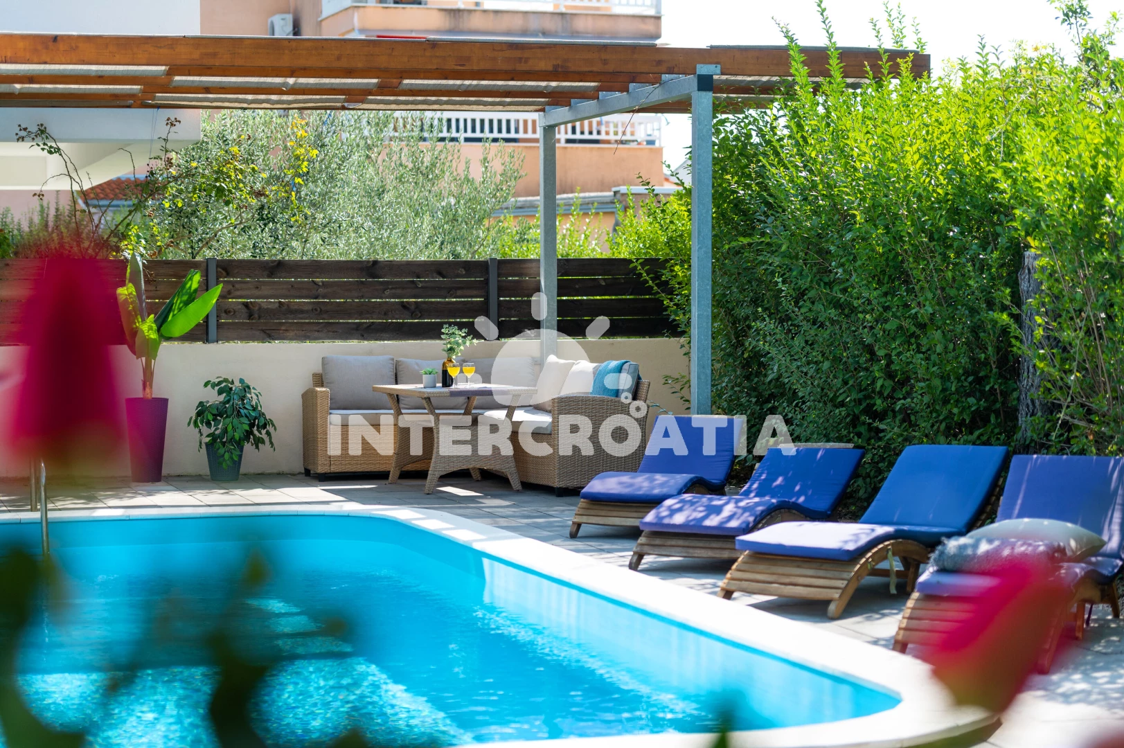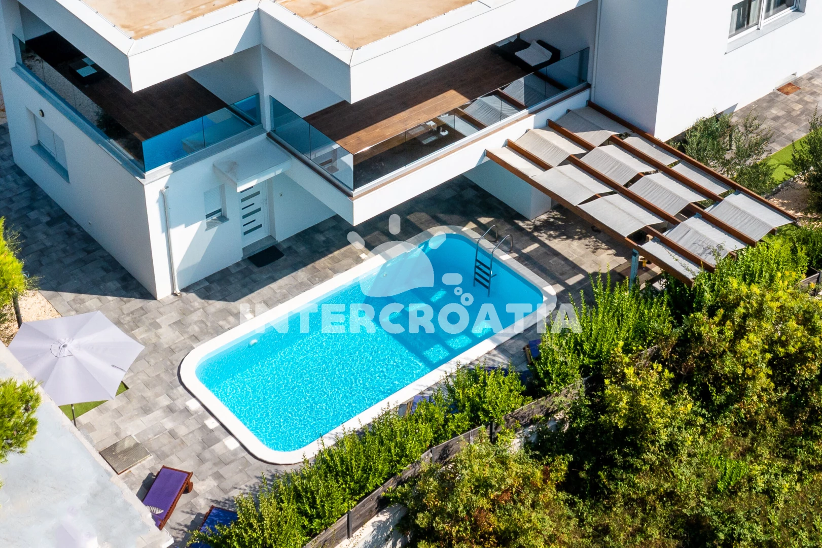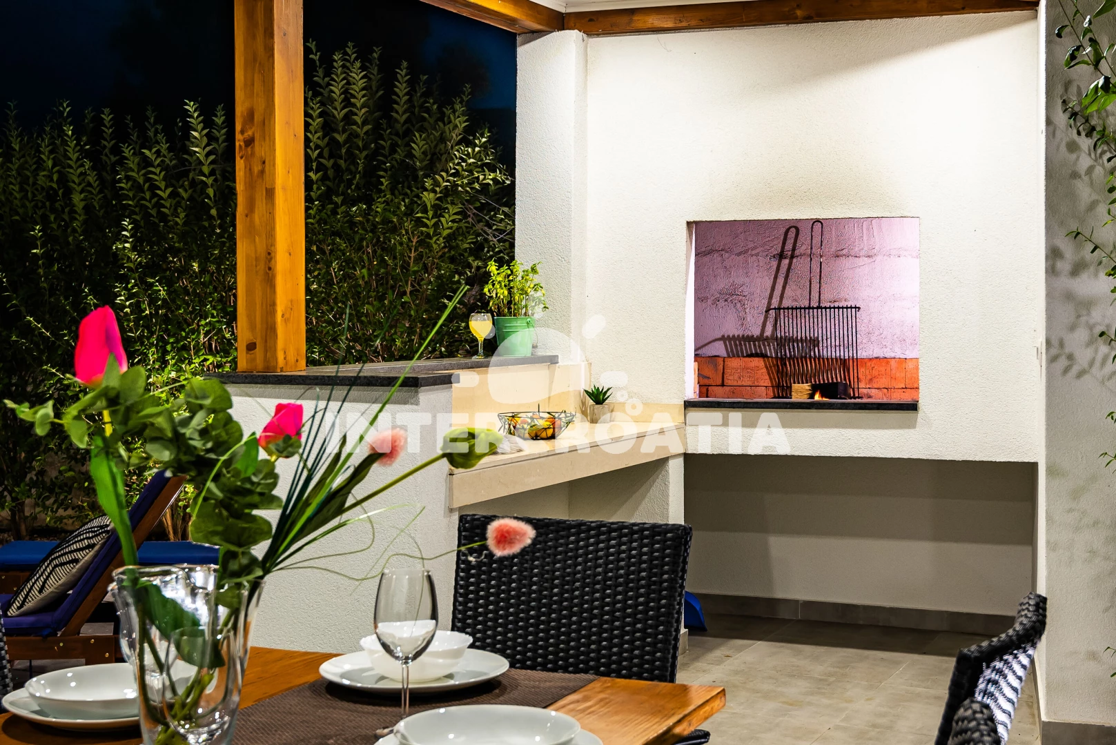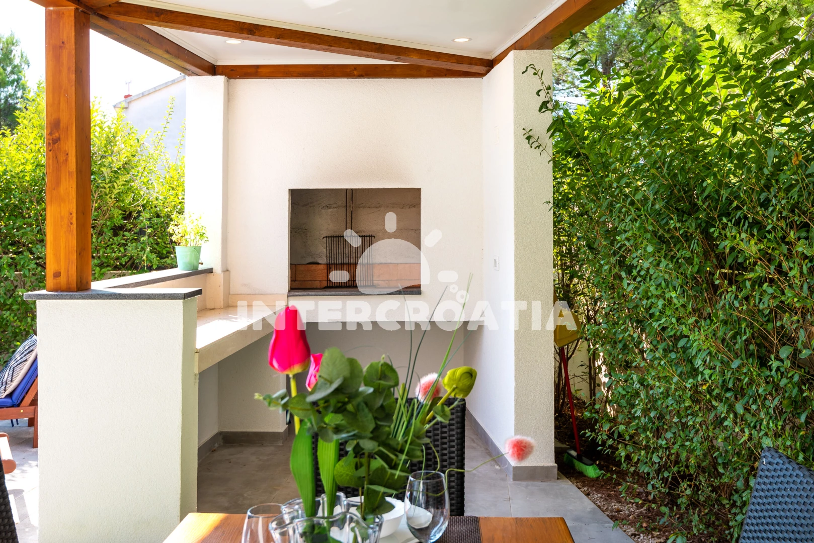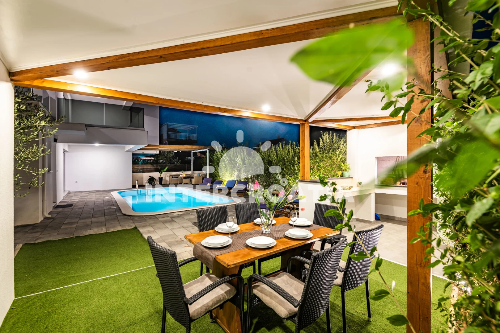 Vila se nachází 300 m od moře a pláže. Pláž je oblázková a betonové desky. Vila disponuje bazénem s lehátky pro ubytované hosty. U objektu je k dispozici společná zahrada s posezením a grilem.