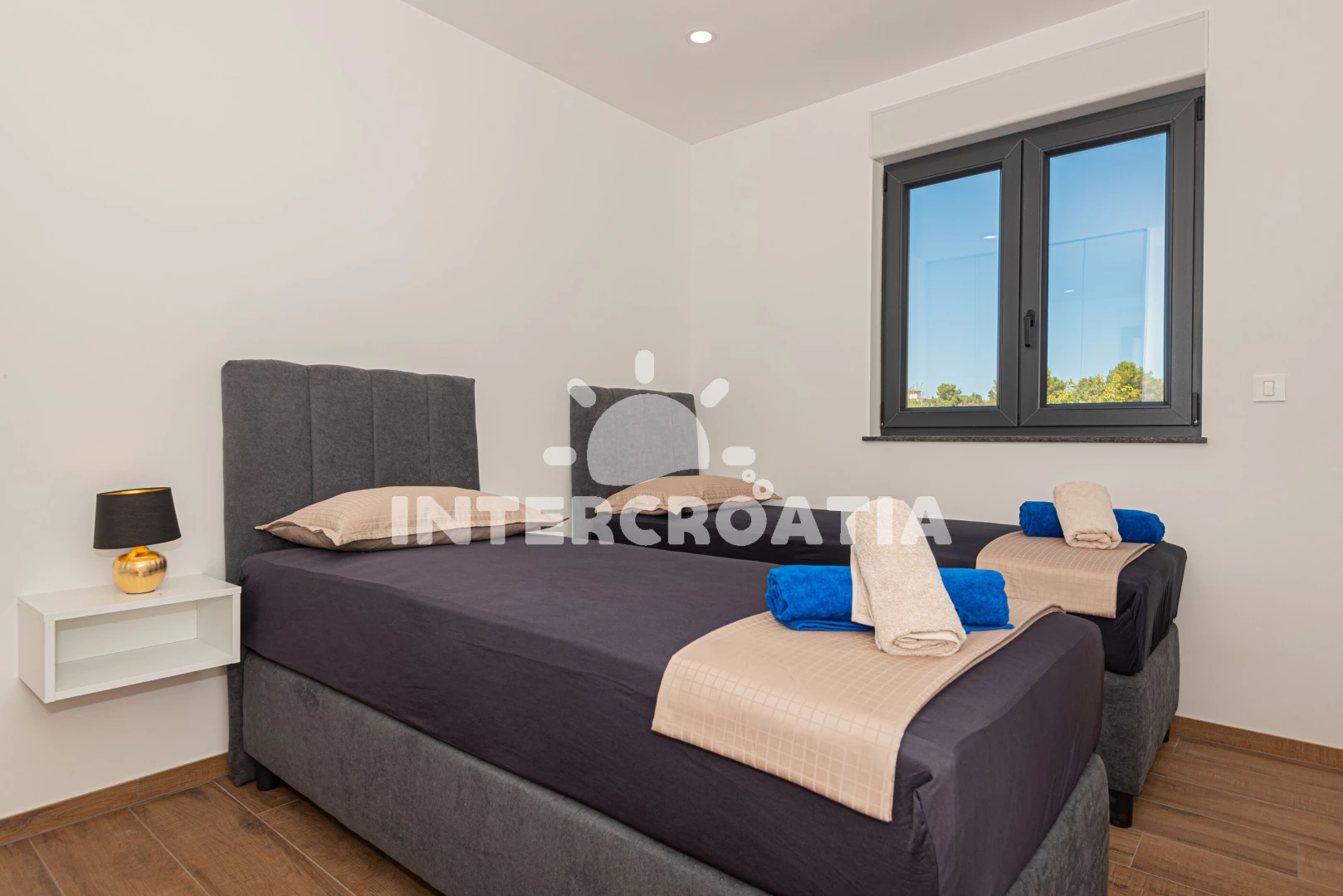 Vila (140 m2) s balkonem. Vila má 4 ložnice a je vhodná pro až 8 osob. Kuchyňská linka je vybavena varnou deskou, troubou, toustovačem, kávovarem, myčkou na nádobí, mikrovlnnou troubou, rychlovarnou konvicí, nádobím, lednicí, mrazákem. K dispozici televize, žehlička. První ložnice s dvoulůžkem. Druhá ložnice s dvoulůžkem. Třetí ložnice s dvoulůžkem. Čtvrtá ložnice se 2 jednolůžky. První koupelna se sprchovým koutem, umyvadlem, fénem a WC. Druhá koupelna se sprchovým koutem, umyvadlem, fénem a WC. Dále samostatné WC.