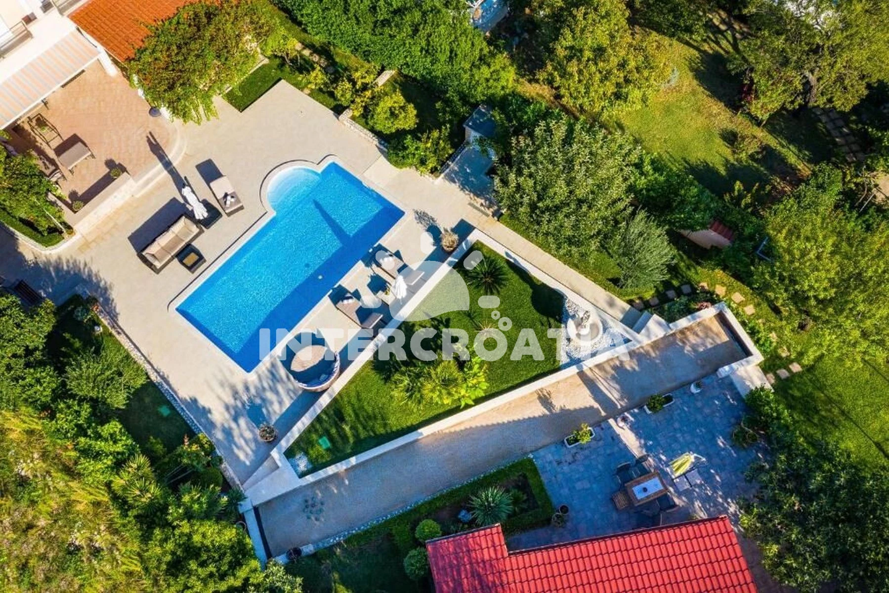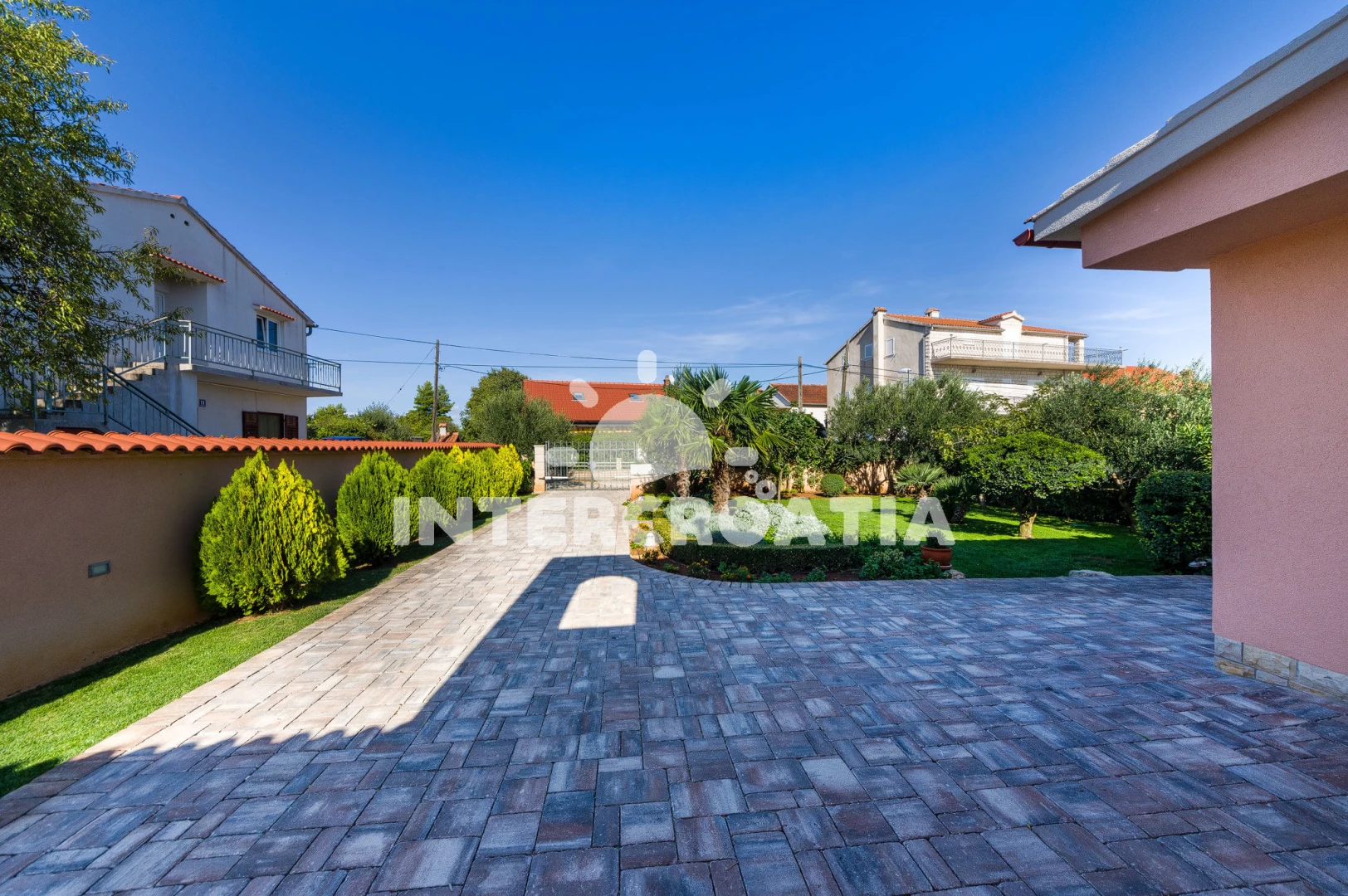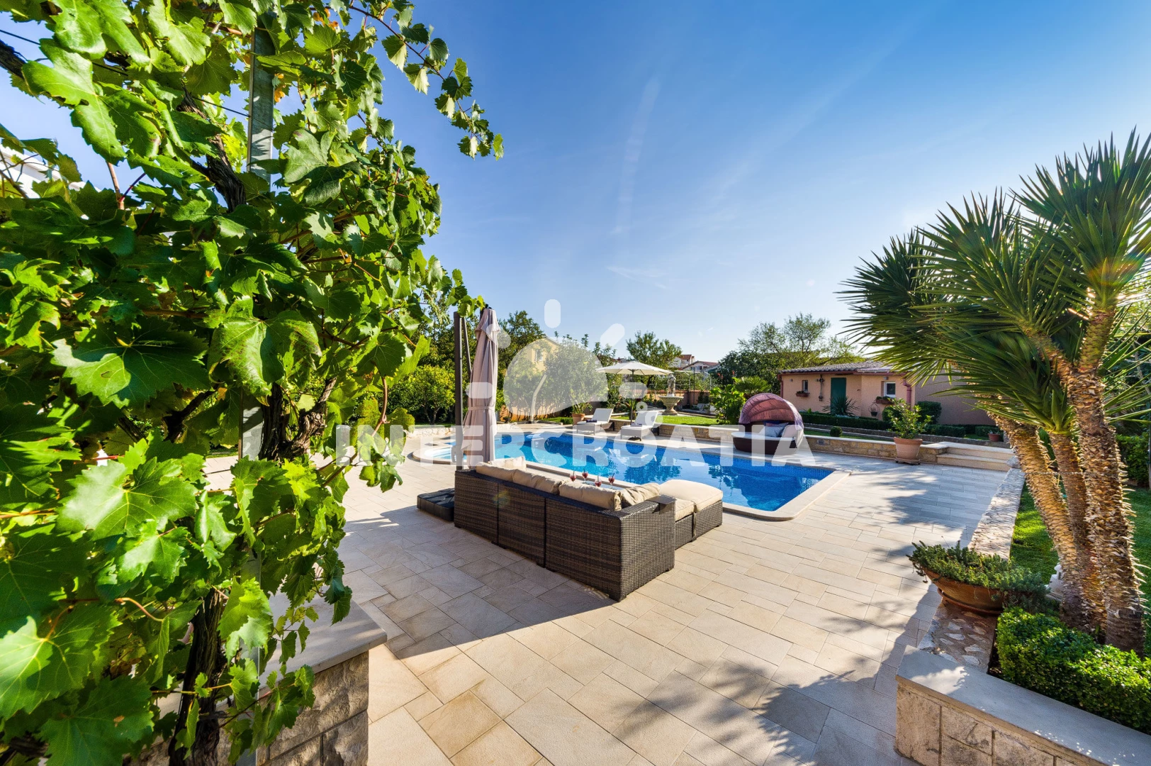 Vila se nachází 1800 m od moře a pláže. Pláž je písčitá a betonové desky. Vila disponuje bazénem s lehátky pro ubytované hosty. U objektu je k dispozici společná zahrada s posezením a grilem. Parkování je před domem.
