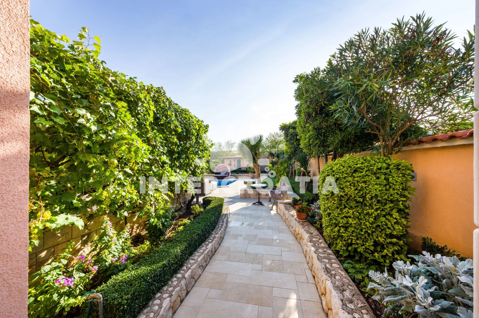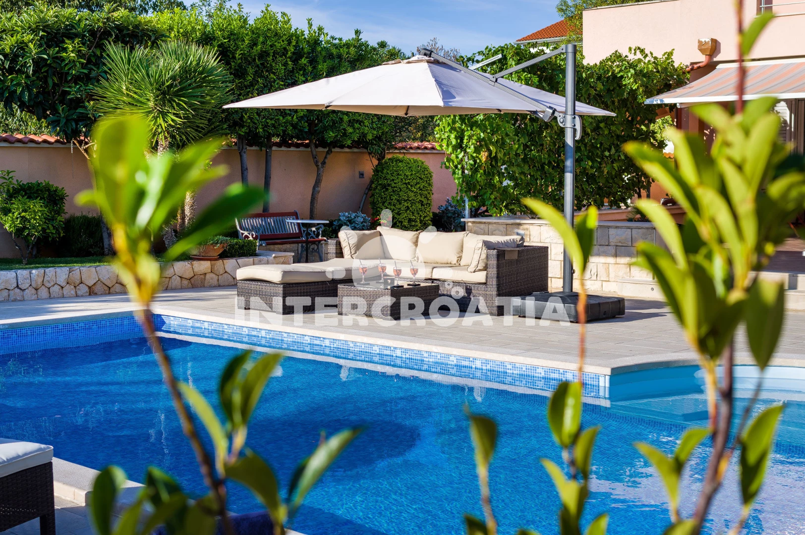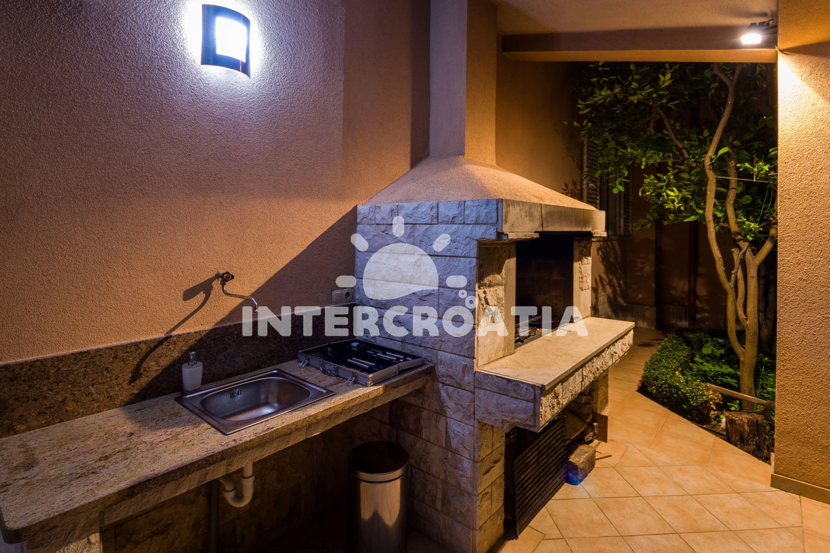 Vila se nachází 1800 m od moře a pláže. Pláž je písčitá a betonové desky. Vila disponuje bazénem s lehátky pro ubytované hosty. U objektu je k dispozici společná zahrada s posezením a grilem. Parkování je před domem.
