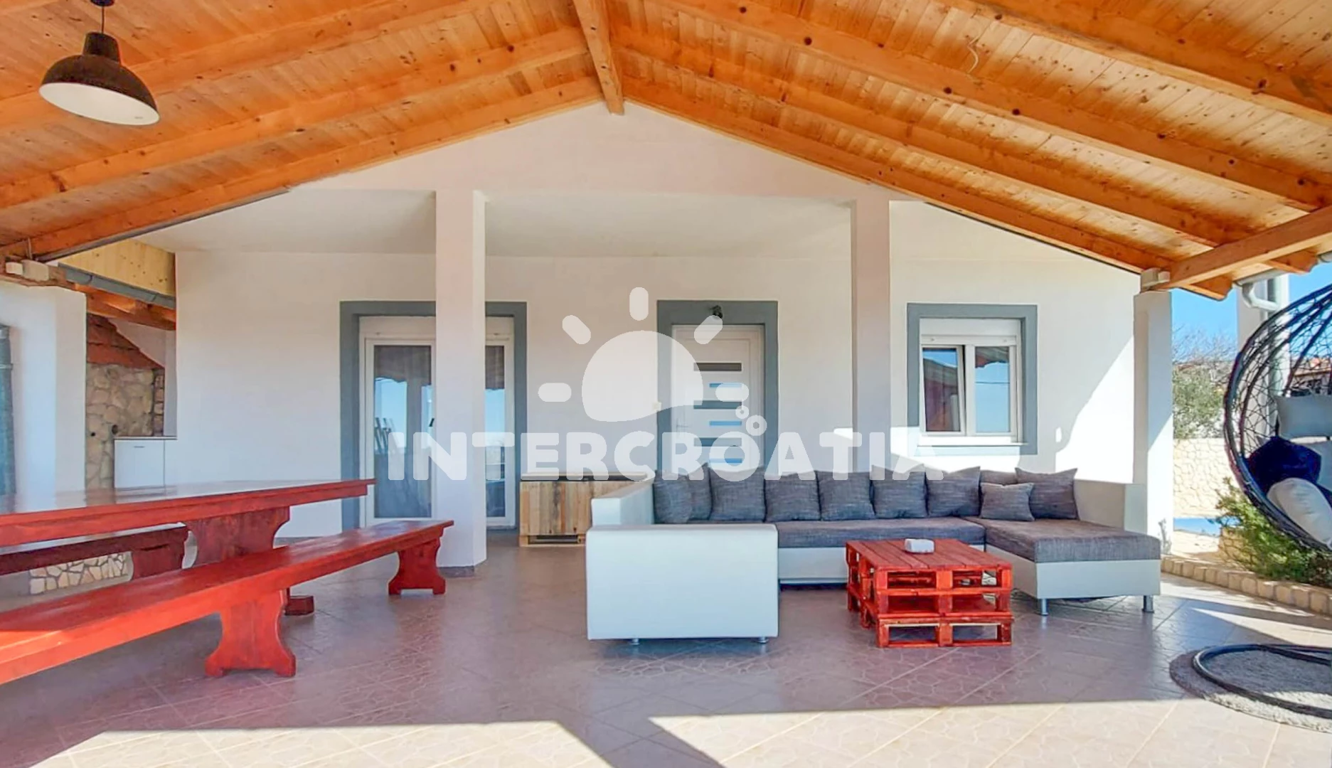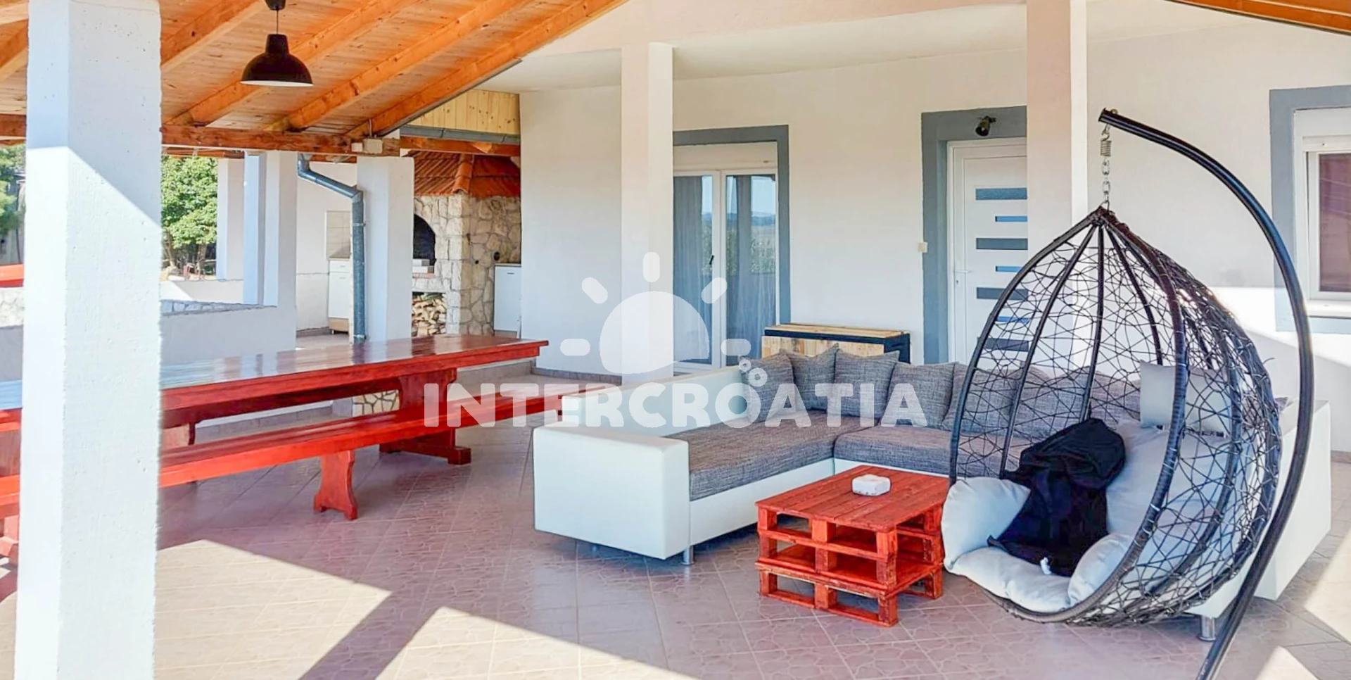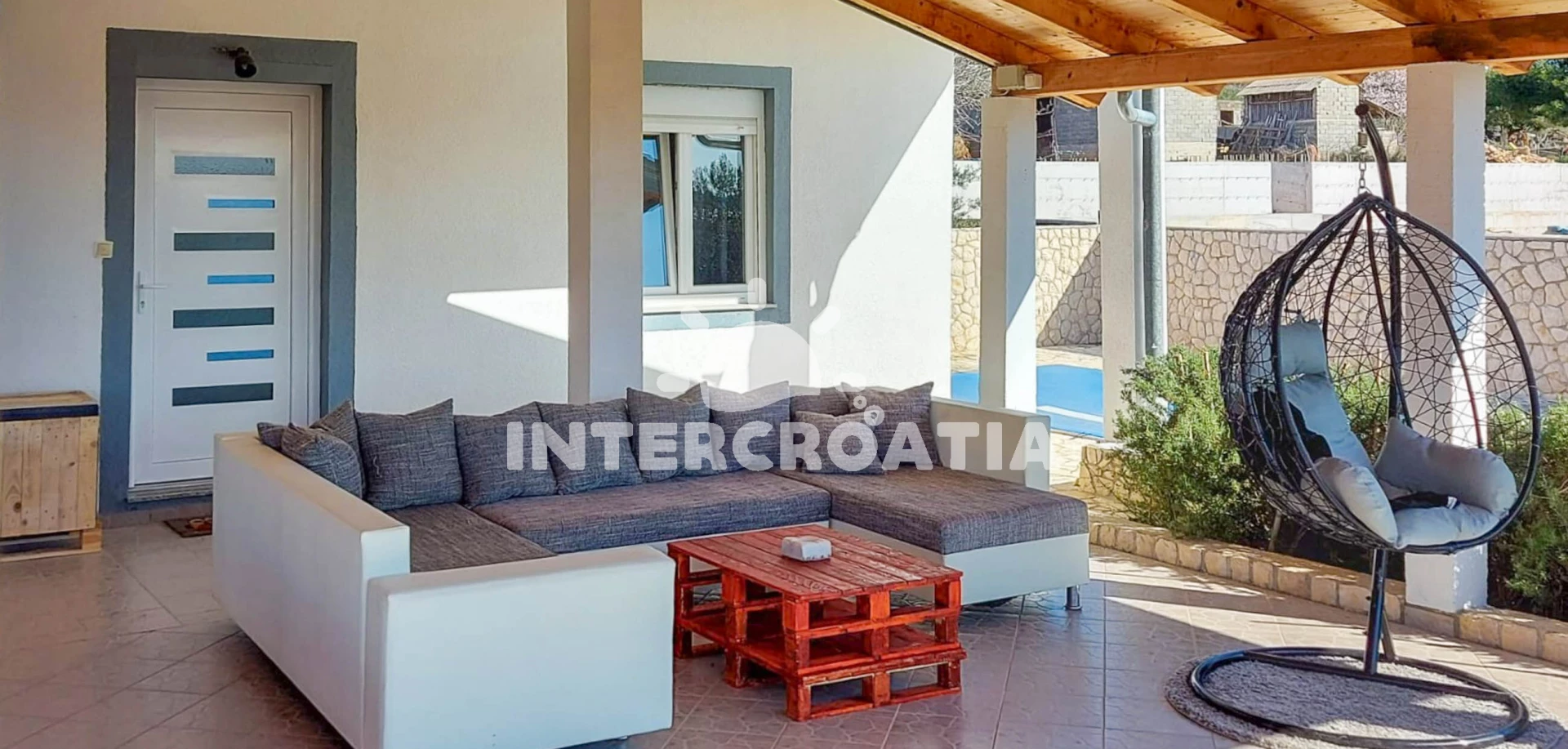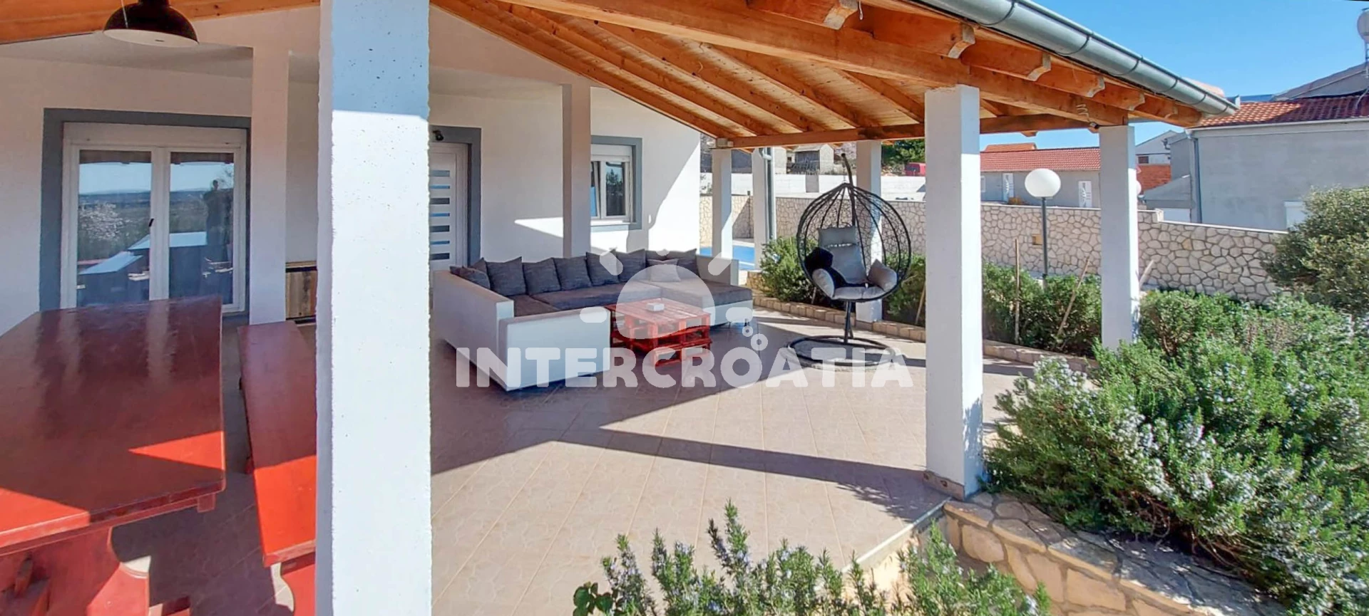 Vila se nachází 8200 m od moře a pláže. Pláž je oblázková. Vila disponuje bazénem s lehátky pro ubytované hosty. U objektu je k dispozici společná zahrada s posezením a grilem. Parkování je před domem.
