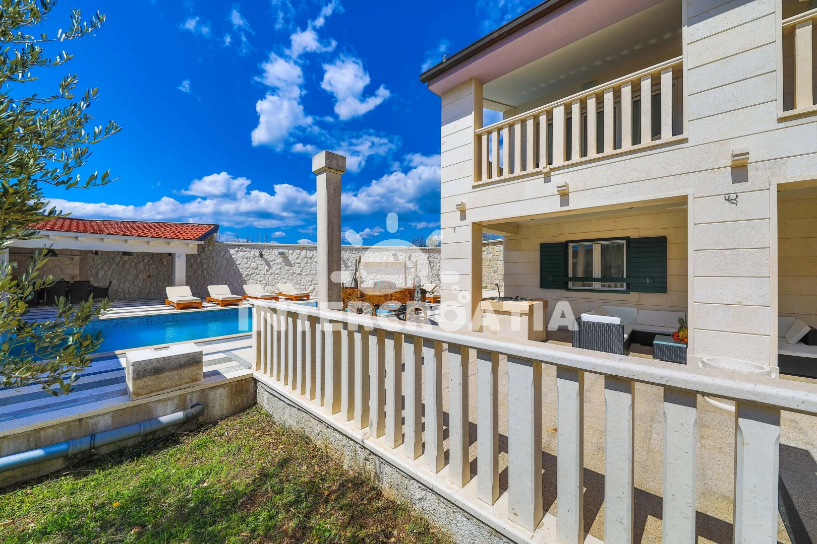 Vila se nachází 20000 m od moře a pláže. Pláž je oblázková. Vila disponuje bazénem s lehátky pro ubytované hosty. U objektu je k dispozici společná zahrada s posezením a grilem. Parkování je před domem.