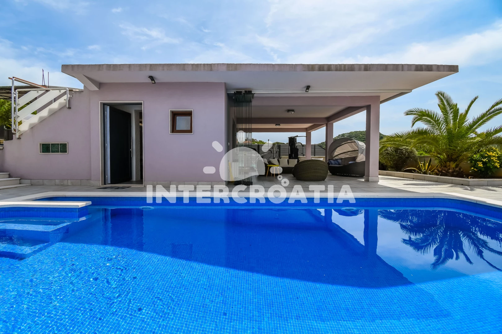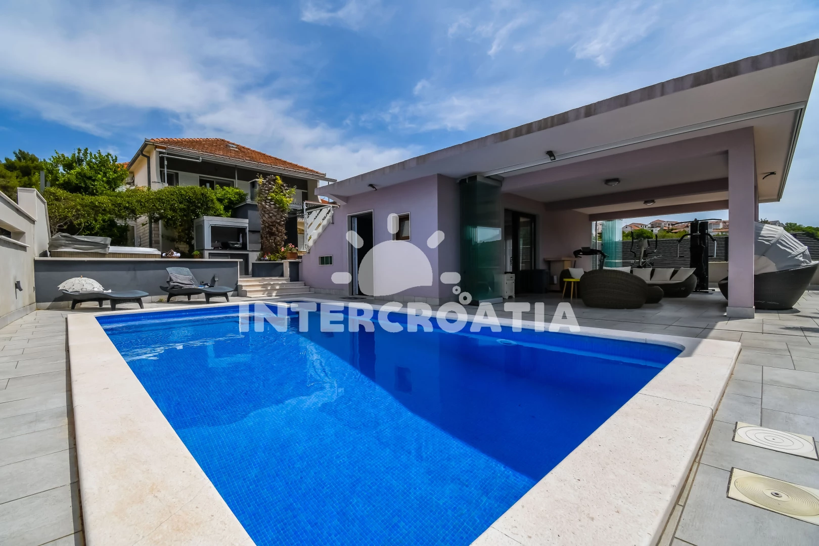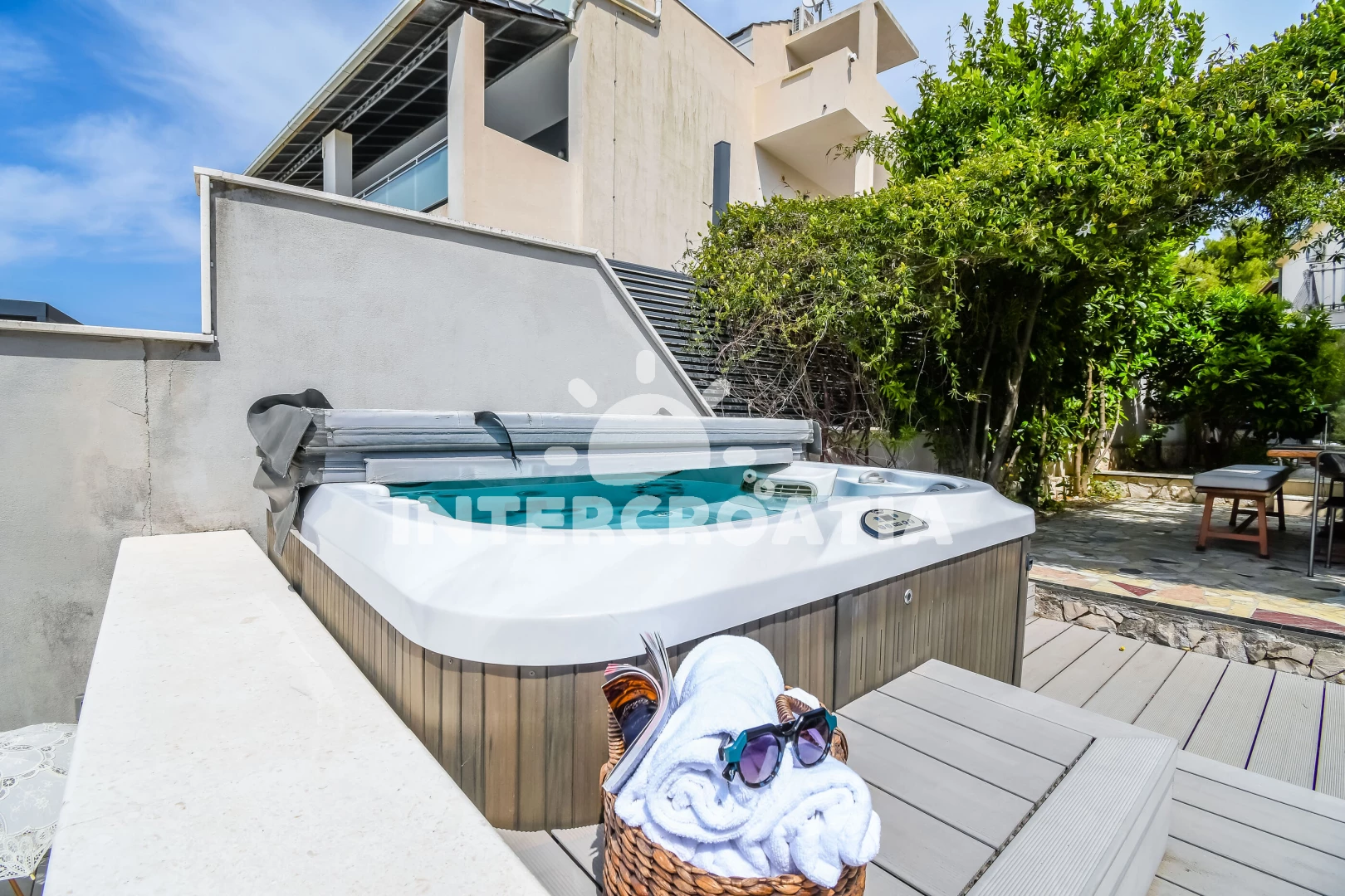 Vila se nachází 300 m od moře a pláže. Pláž je oblázková a betonové desky. Vila disponuje bazénem s lehátky pro ubytované hosty. K dispozici vířivka, posilovna. U objektu je k dispozici společná zahrada s posezením a grilem.