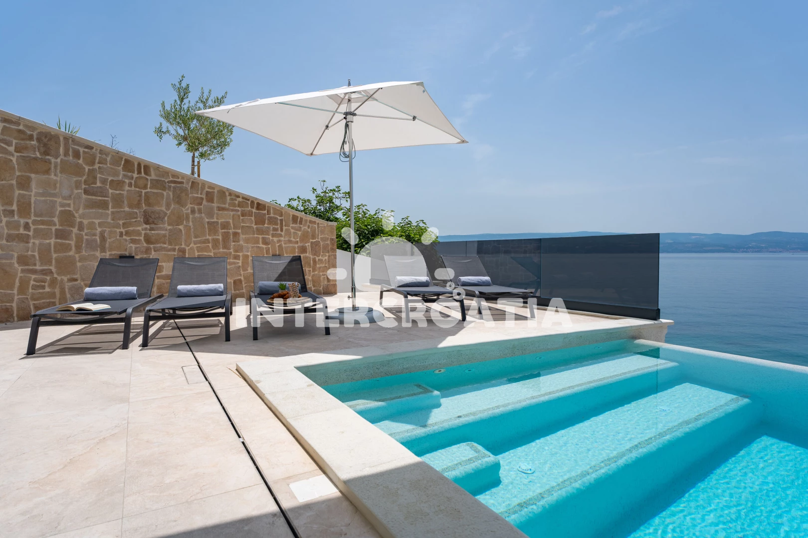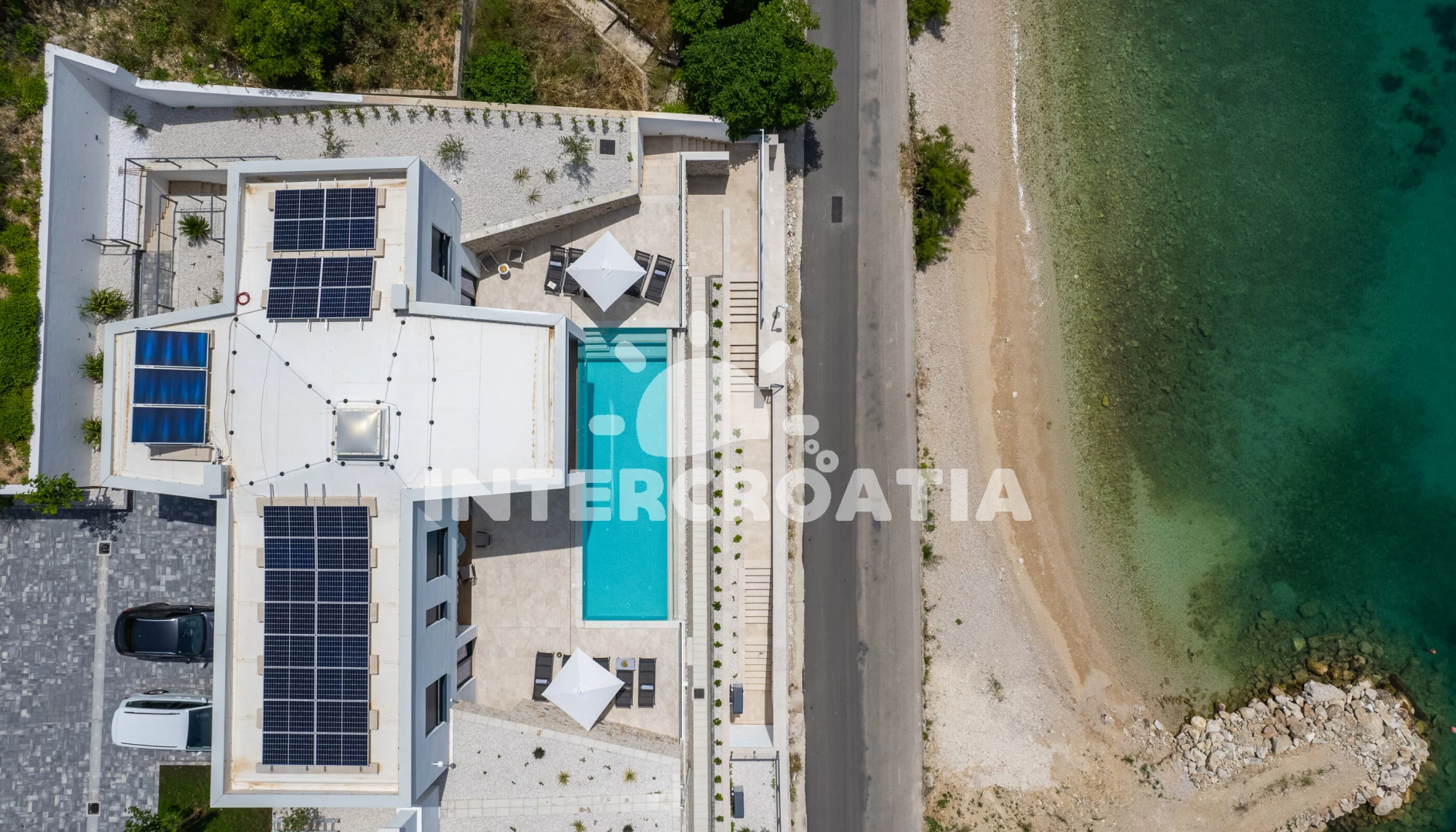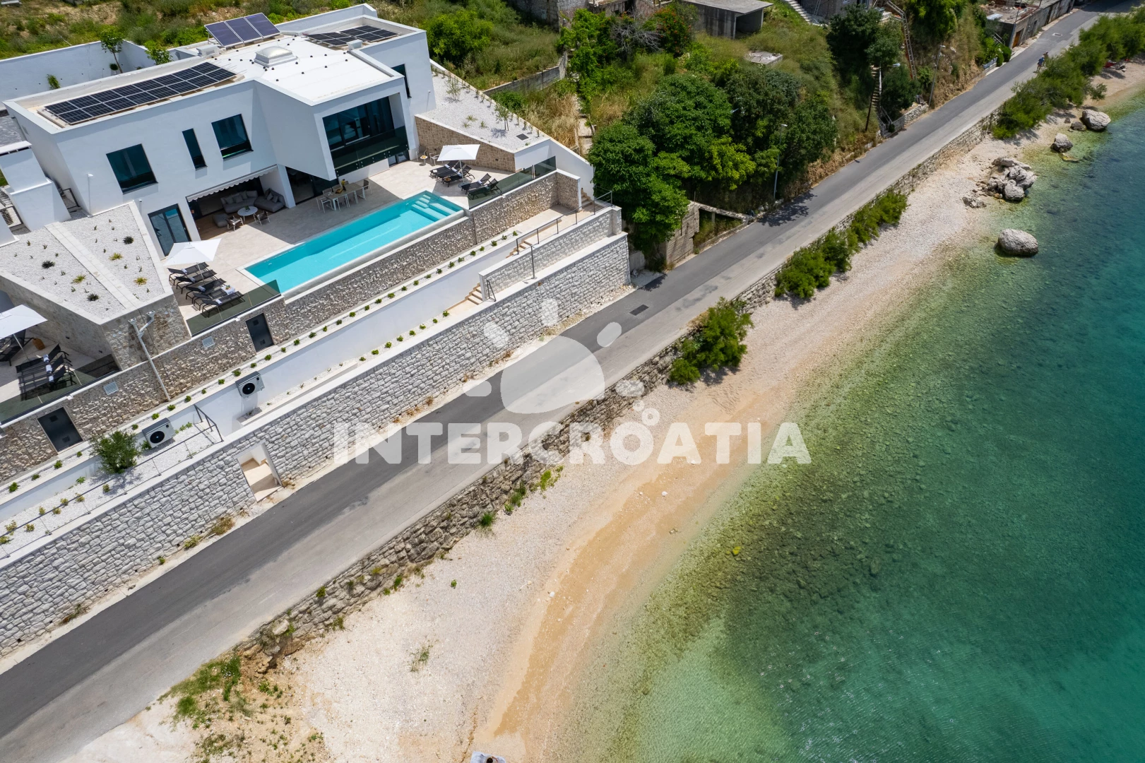 Vila se nachází 35 m od moře a pláže. Pláž je oblázková. Vila disponuje bazénem s lehátky pro ubytované hosty. K dispozici posilovna, sauna. U objektu je k dispozici společná zahrada s posezením a grilem.