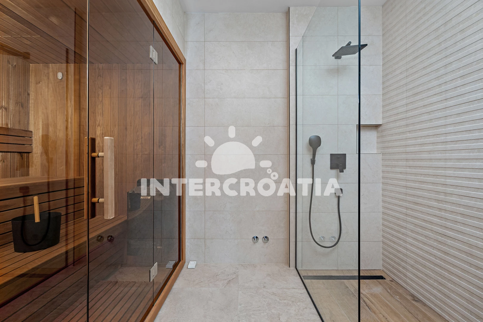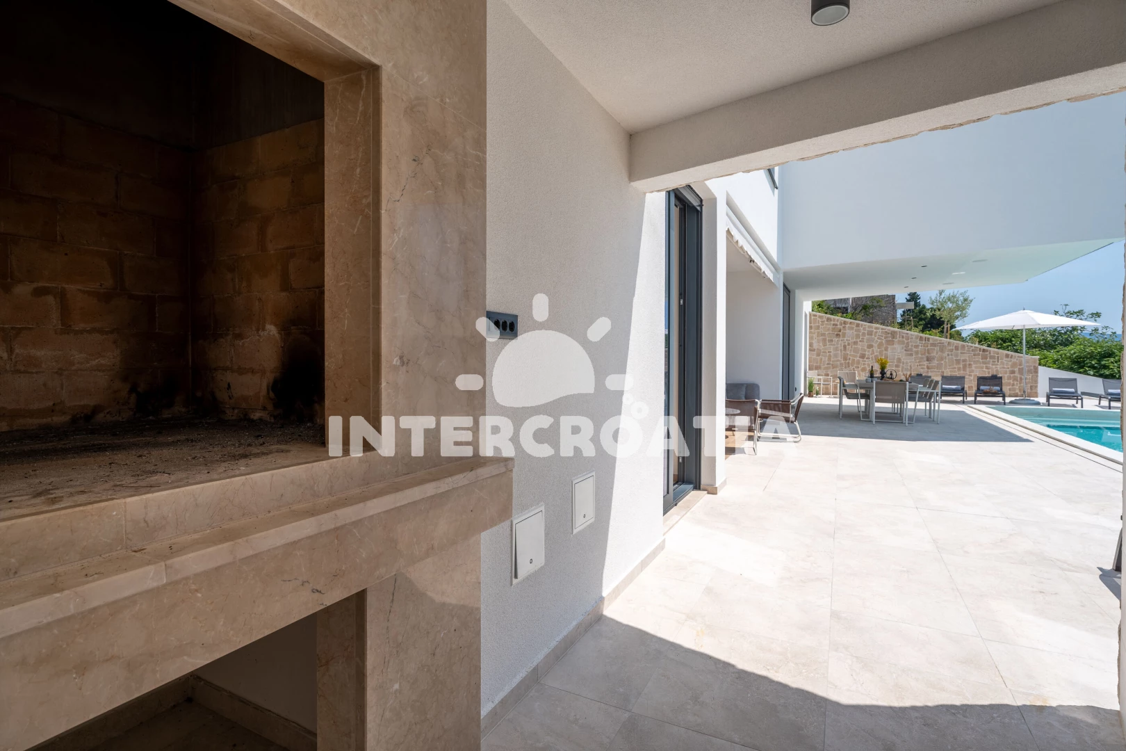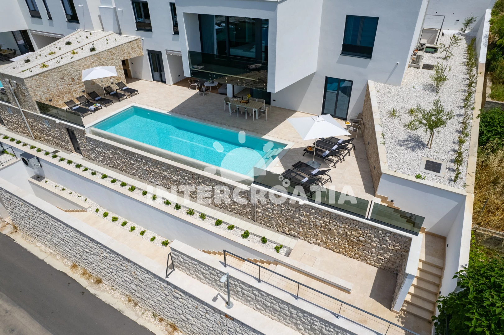 Vila se nachází 35 m od moře a pláže. Pláž je oblázková. Vila disponuje bazénem s lehátky pro ubytované hosty. K dispozici posilovna, sauna. U objektu je k dispozici společná zahrada s posezením a grilem.