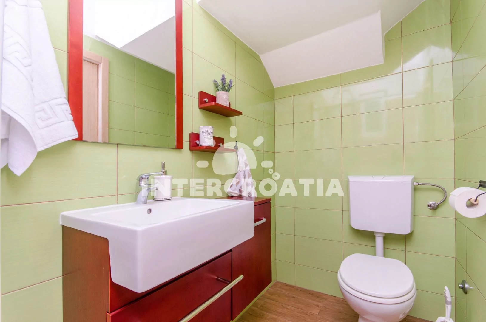 Prostorná, dvoupatrová vilka pro 4 až 6 osob na dvou etážích. V přízemí obývací pokoj s kuchyní. V prvním patře tři samostatné ložnice. Kuchyňská linka je vybavena sporákem, myčkou na nádobí, mikrovlnnou troubou, rychlovarnou konvicí, kávovarem, toustovačem, nádobím a lednicí s mrazákem. Obývací pokoj s jídelním stolem pro 4 osoby, sedací soupravou, televizí se satelitním programem, DVD přehrávačem a vstupem na terasu. První ložnice s jedním dvoulůžkem a vstupem na balkon. Druhá ložnice s dvěma jednolůžky. Třetí ložnice s patrovou postelí. První koupelna se sprchovým koutem umyvadlem, pračkou, fénem a wc. Druhá koupelna se sprchovým koutem, umyvadlem a wc. Hostům je k dispozici parkování u objektu zdarma.
