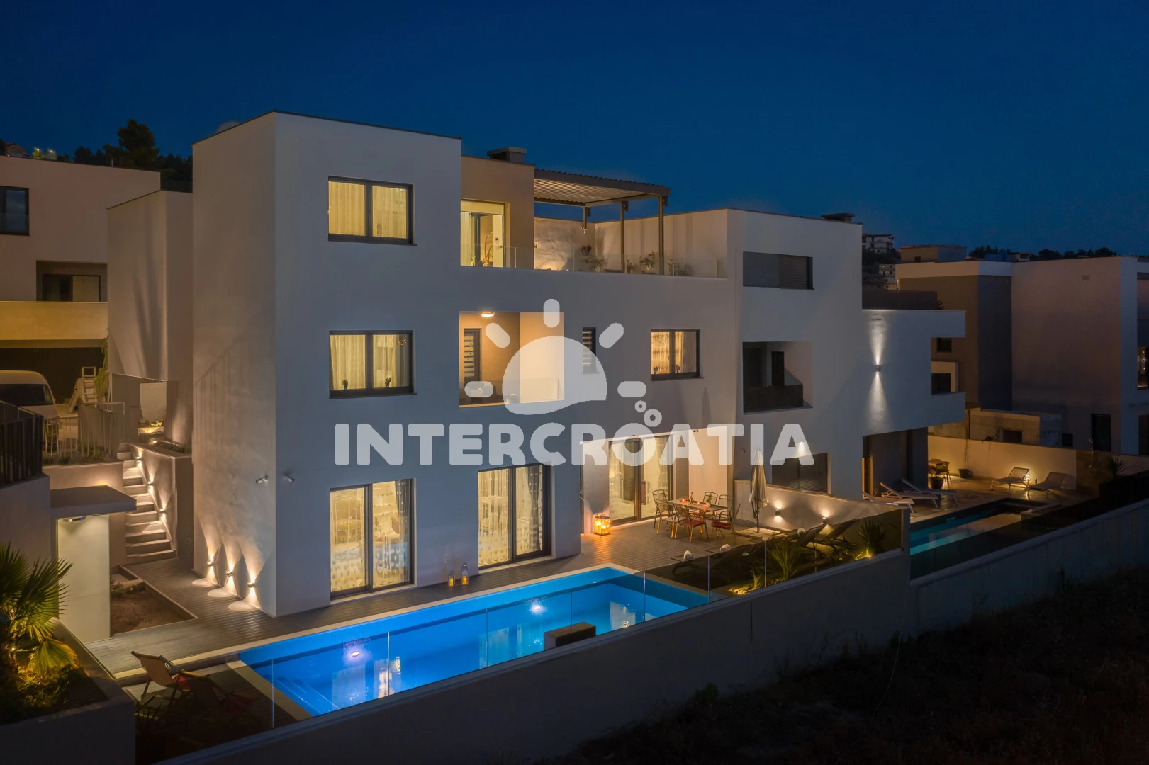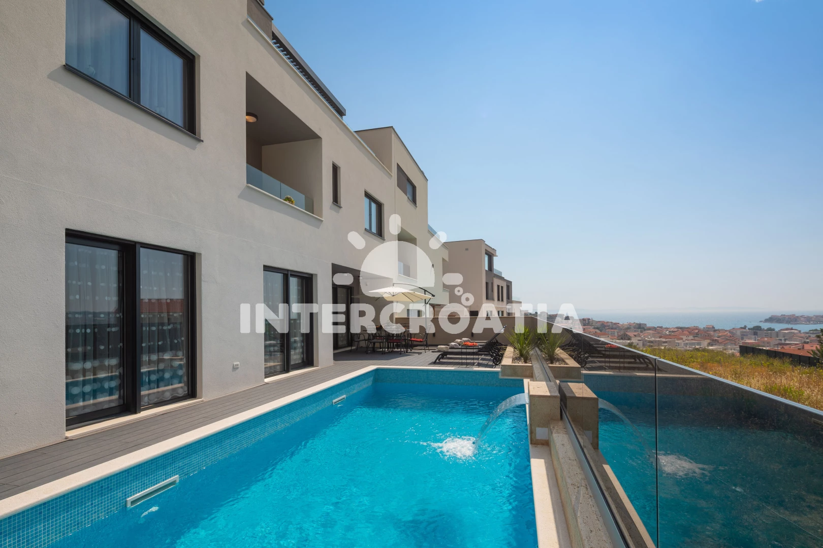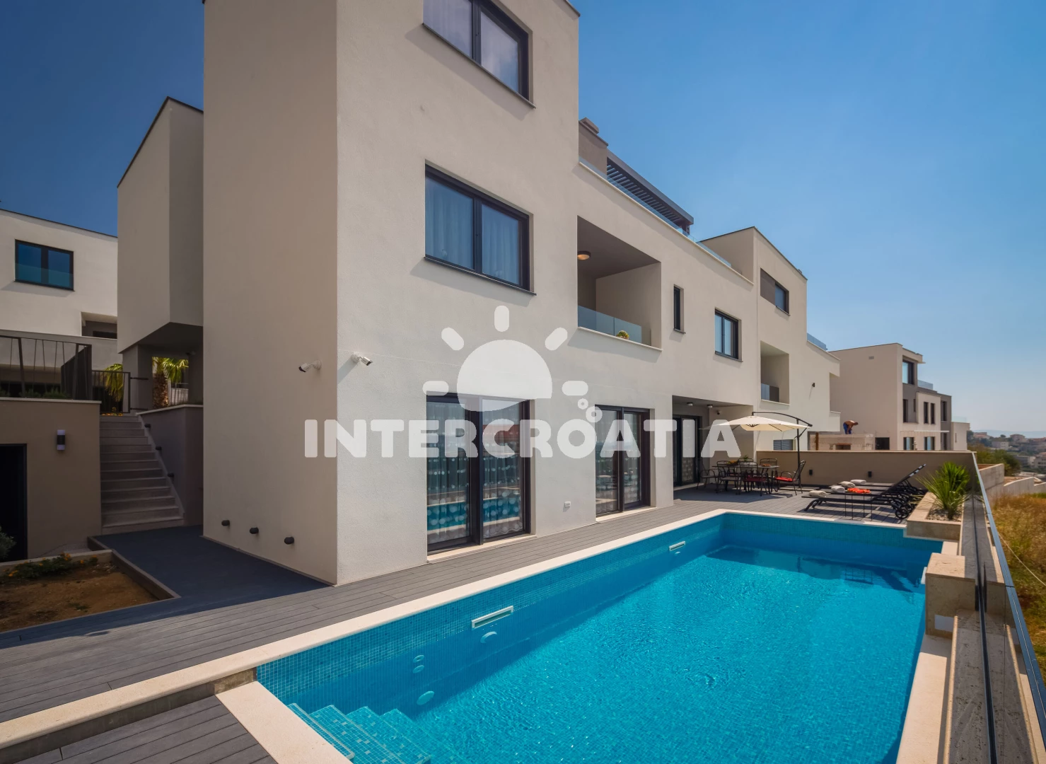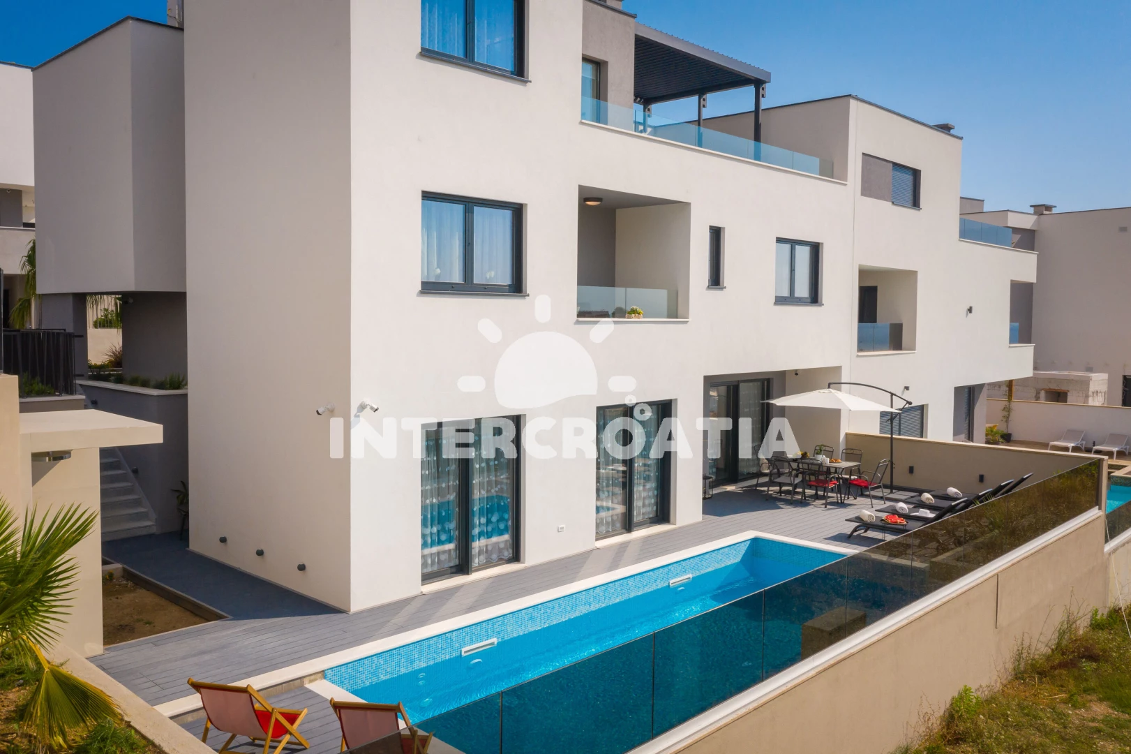 Vila se nachází 900 m od moře a pláže. Pláž je písečná. Vila disponuje bazénem s lehátky pro ubytované hosty. K dispozici posilovna. U objektu je k dispozici společná zahrada s posezením a grilem. Parkování je před domem.