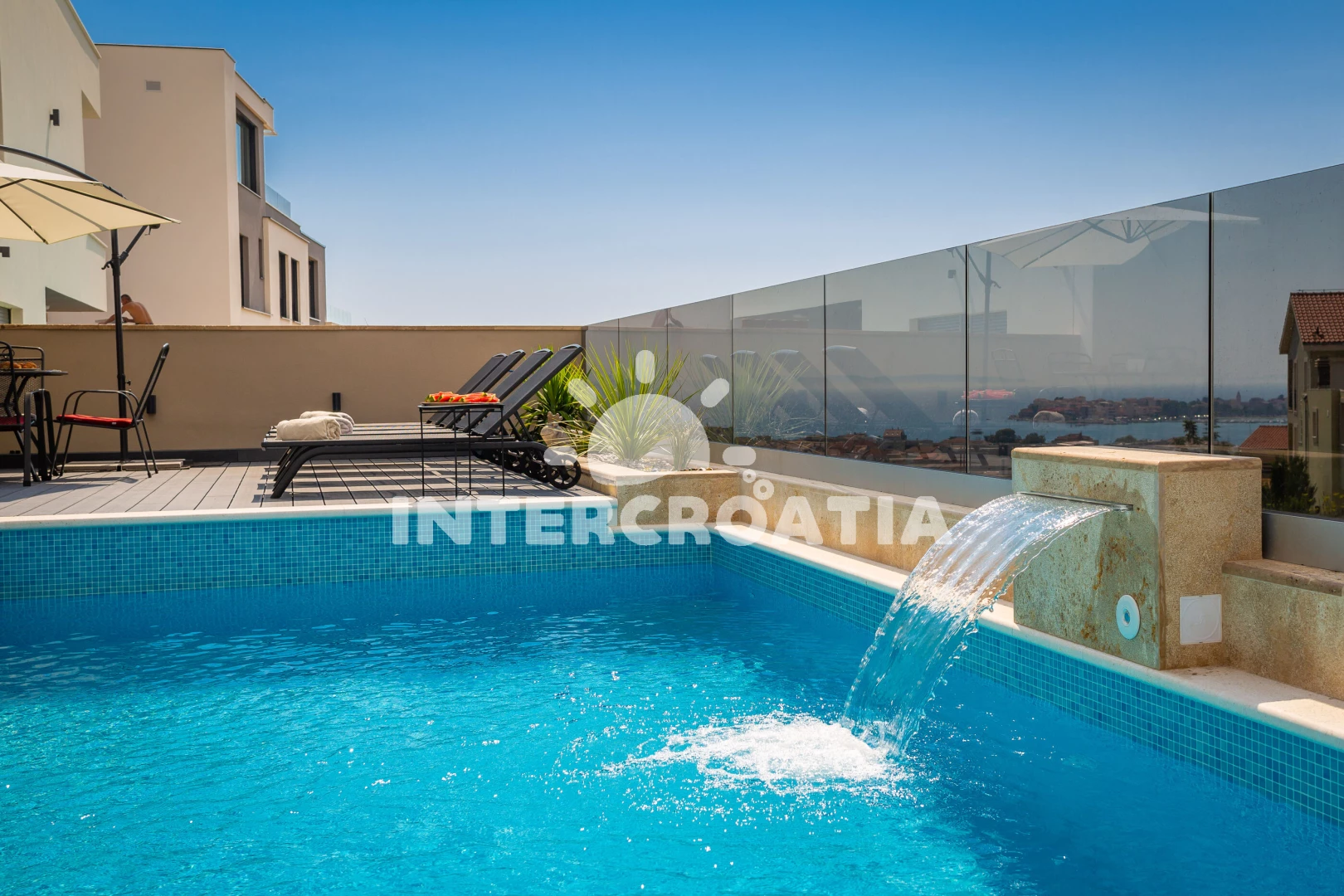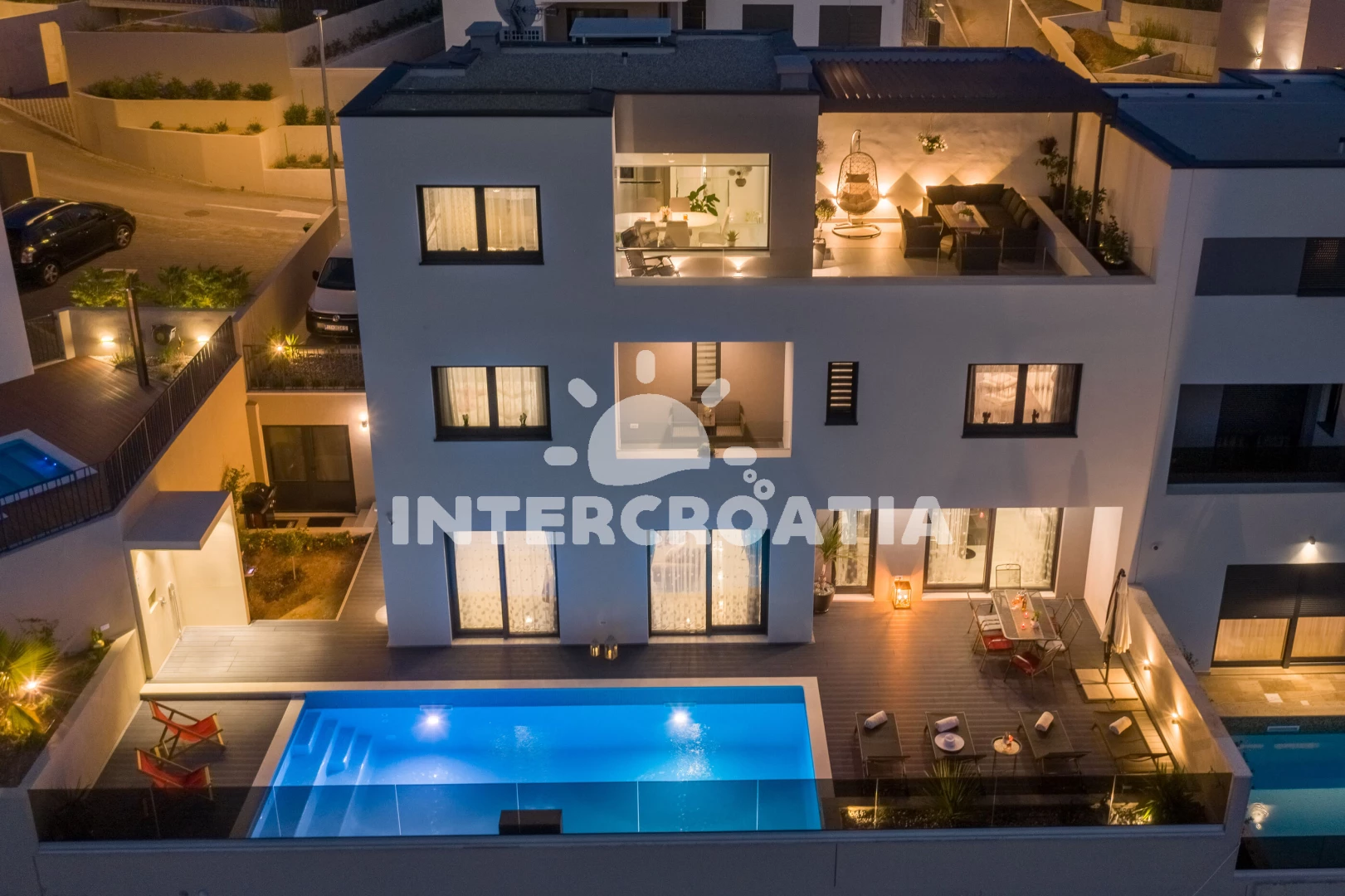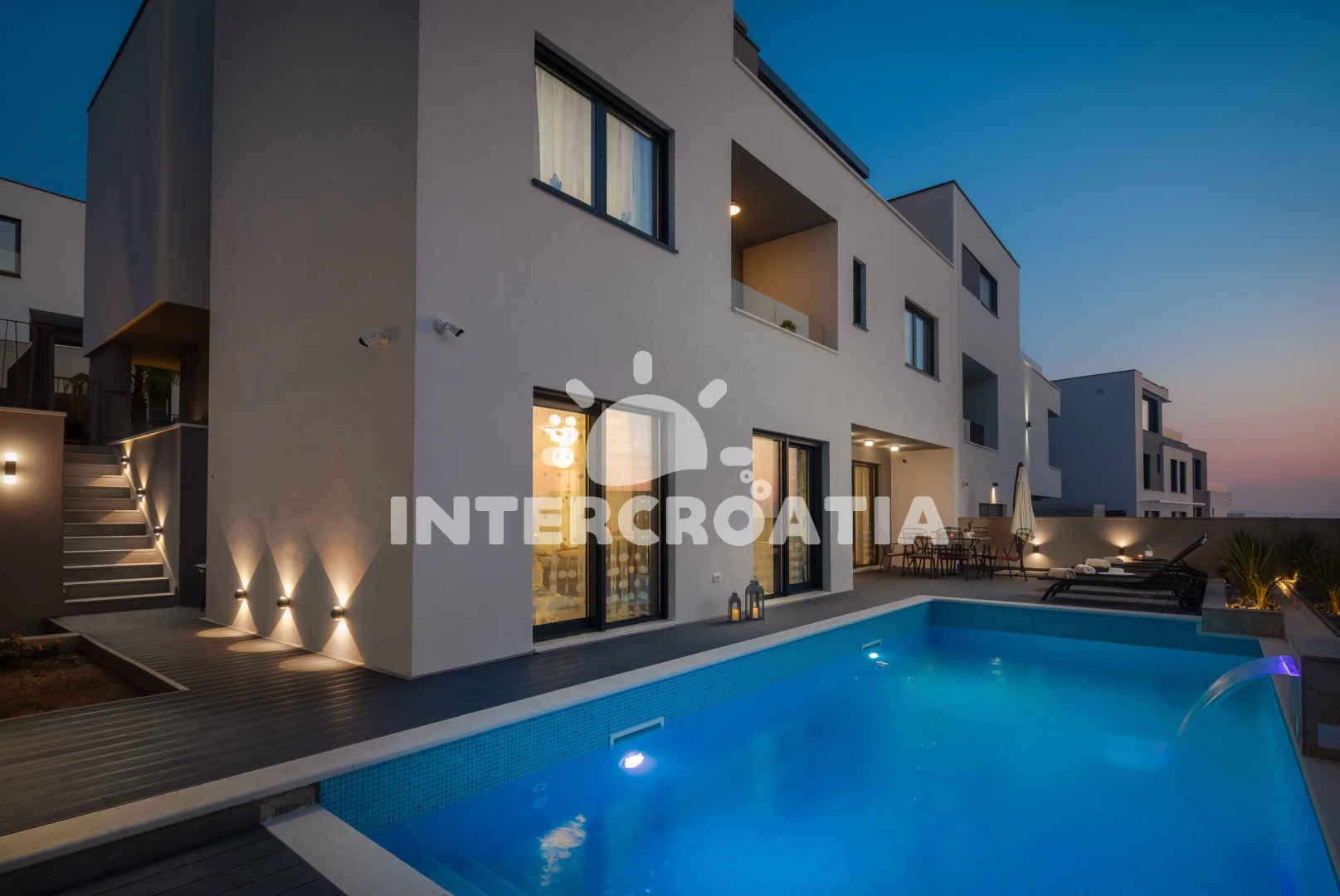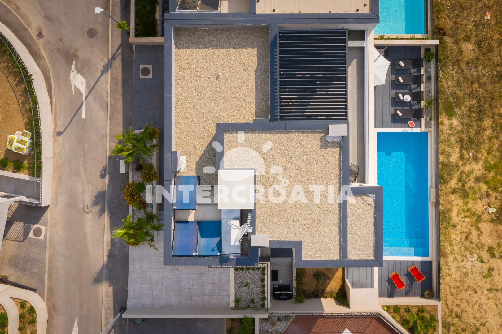 Vila se nachází 900 m od moře a pláže. Pláž je písečná. Vila disponuje bazénem s lehátky pro ubytované hosty. K dispozici posilovna. U objektu je k dispozici společná zahrada s posezením a grilem. Parkování je před domem.